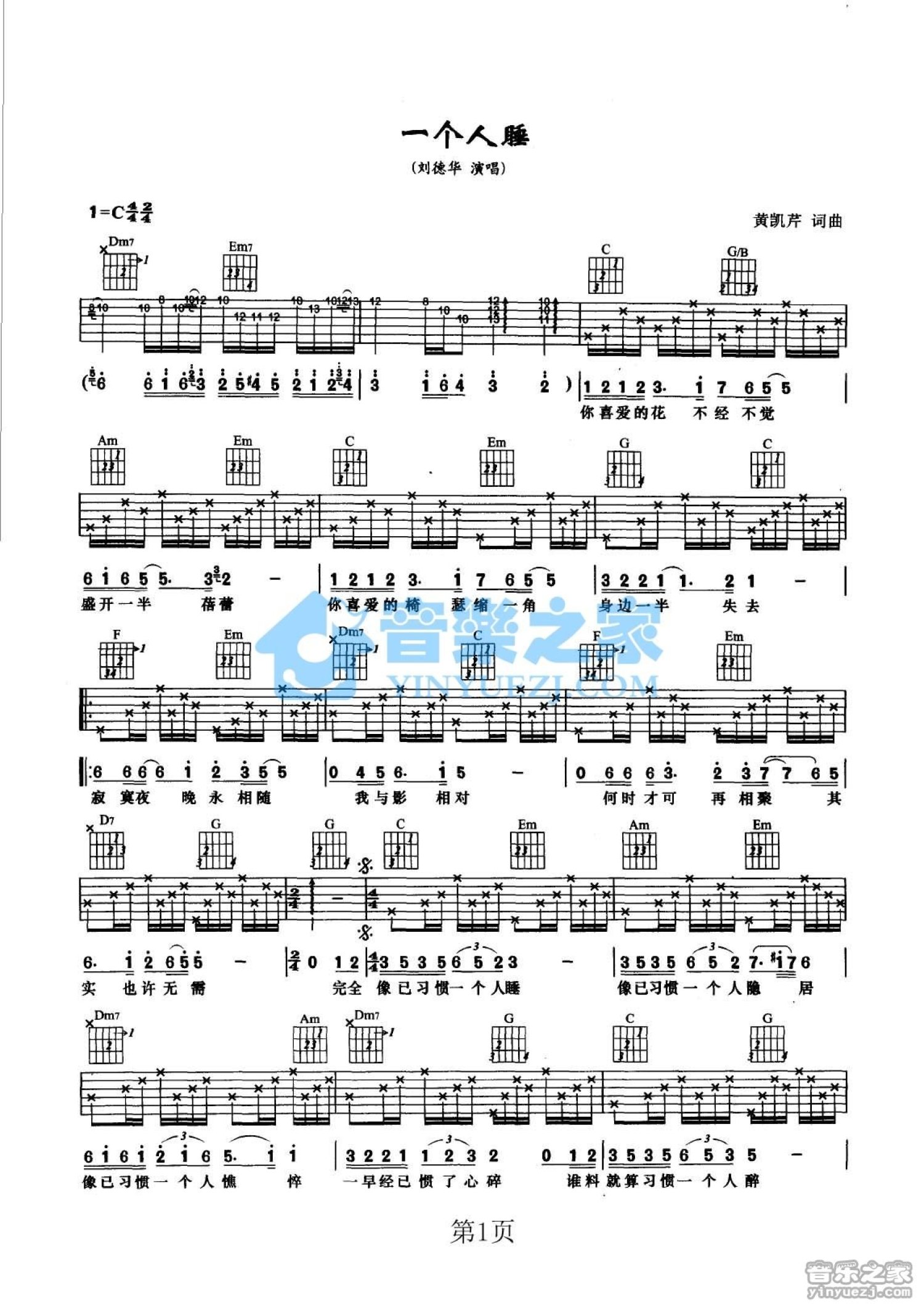 曲谱介绍: C调《一个人睡》吉他弹唱六线谱