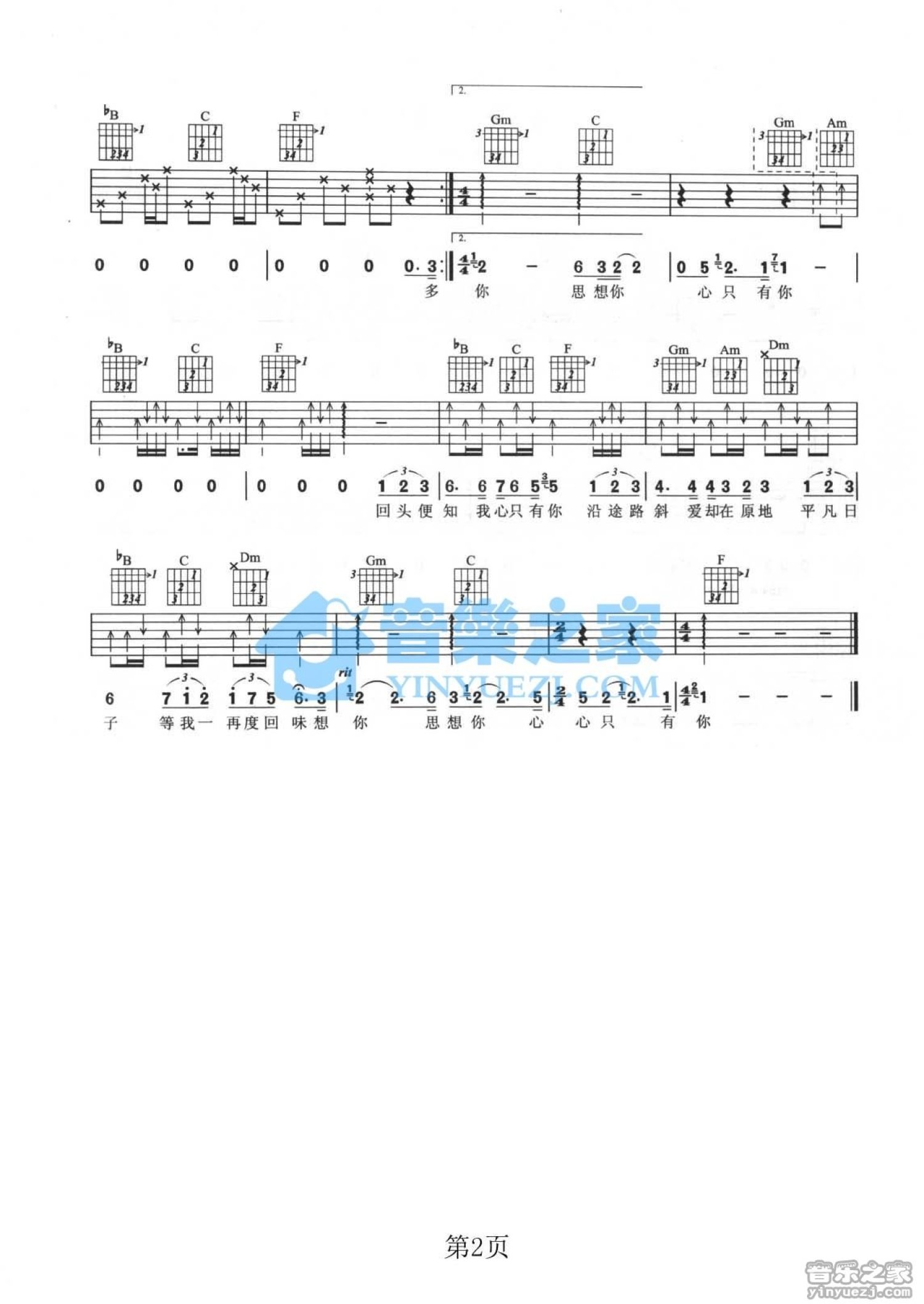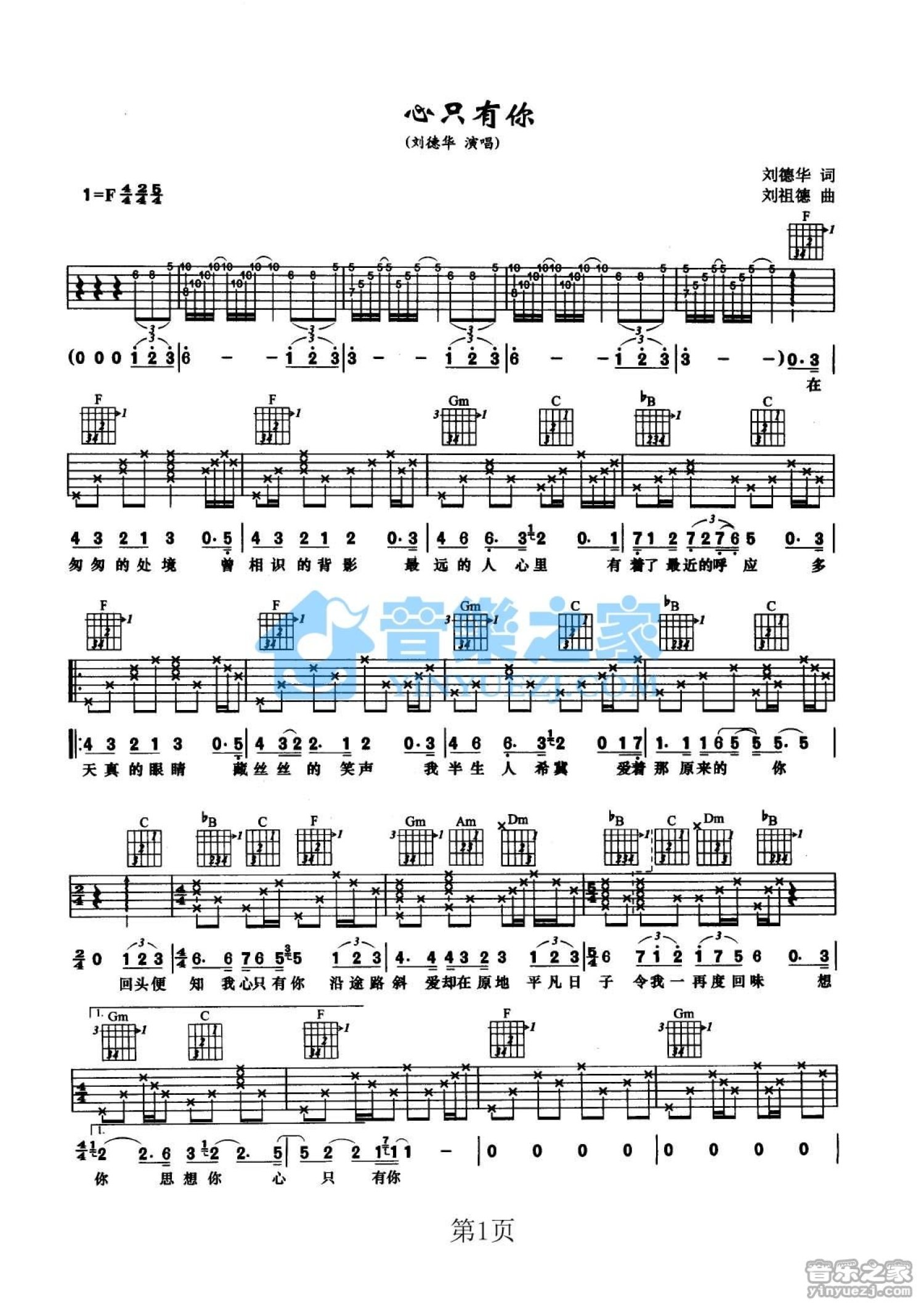 曲谱介绍: F调版《心只有你》吉他弹唱六线谱