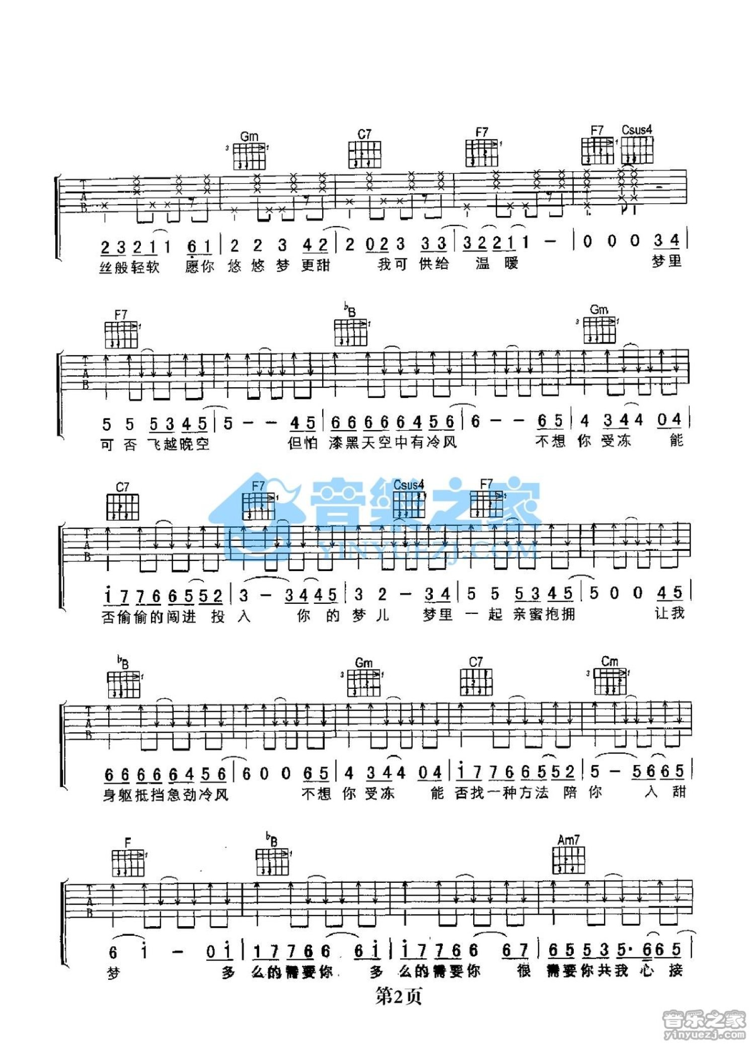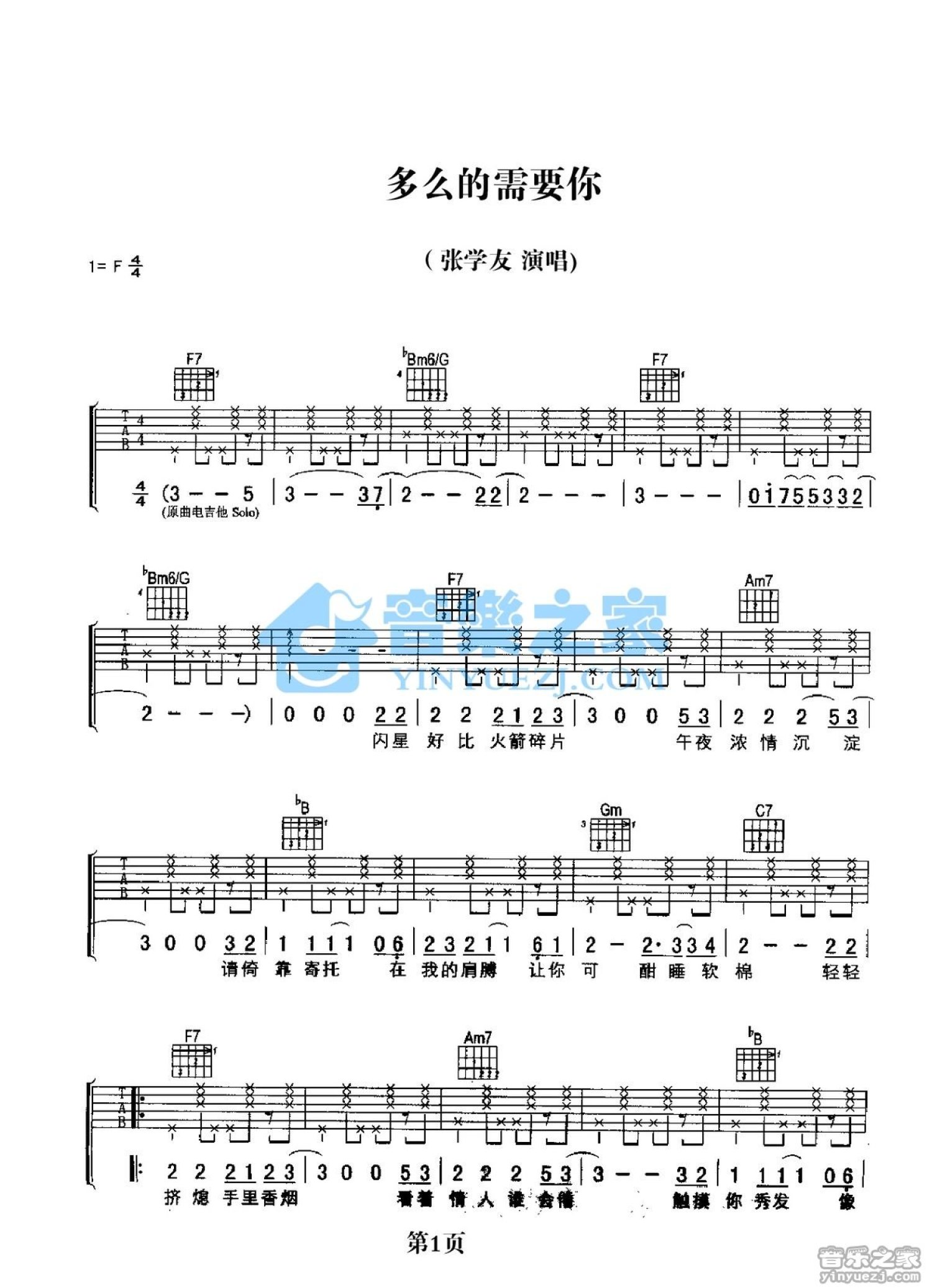 曲谱介绍: F调版《多么的需要你》吉他弹唱六线谱