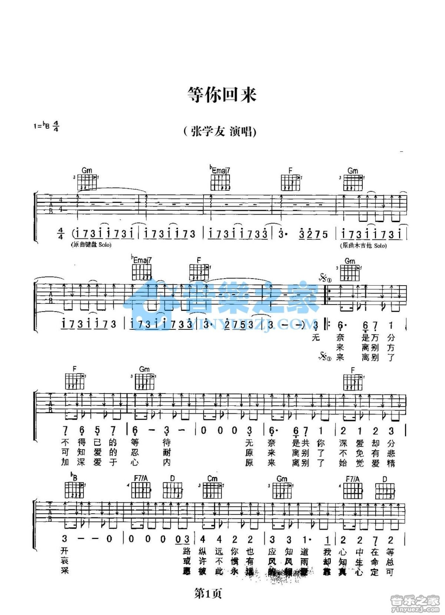 曲谱介绍: bB调版《等你回来》吉他弹唱六线谱