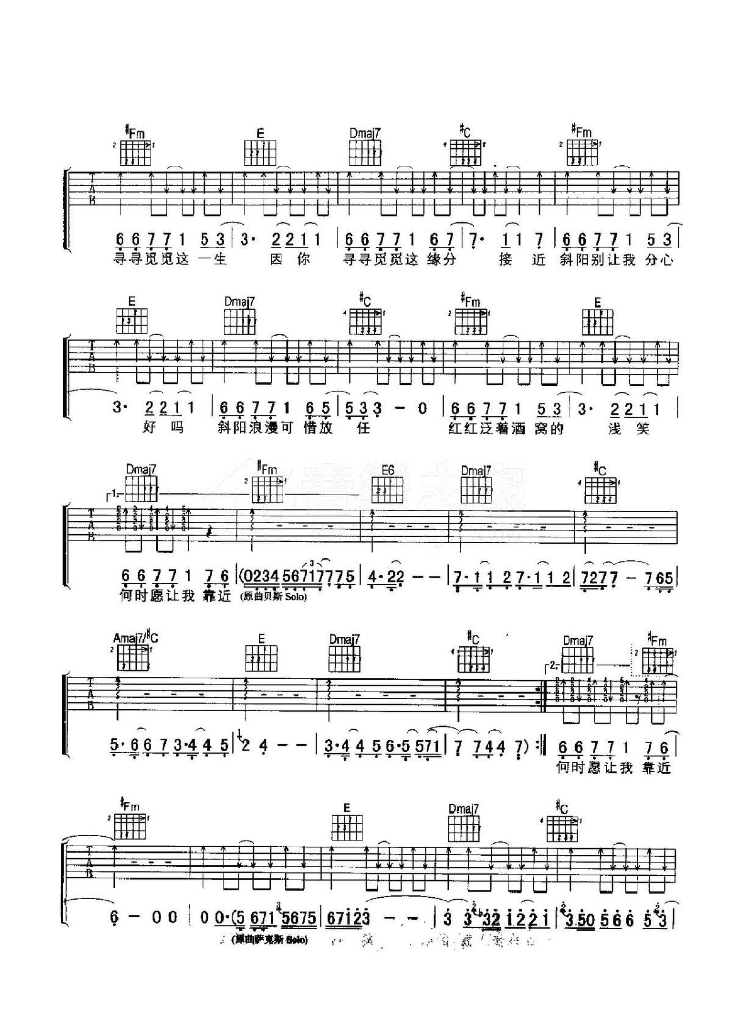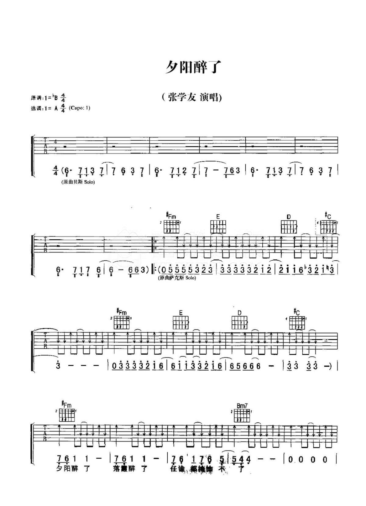 曲谱介绍: A调《夕阳醉了》吉他弹唱六线谱