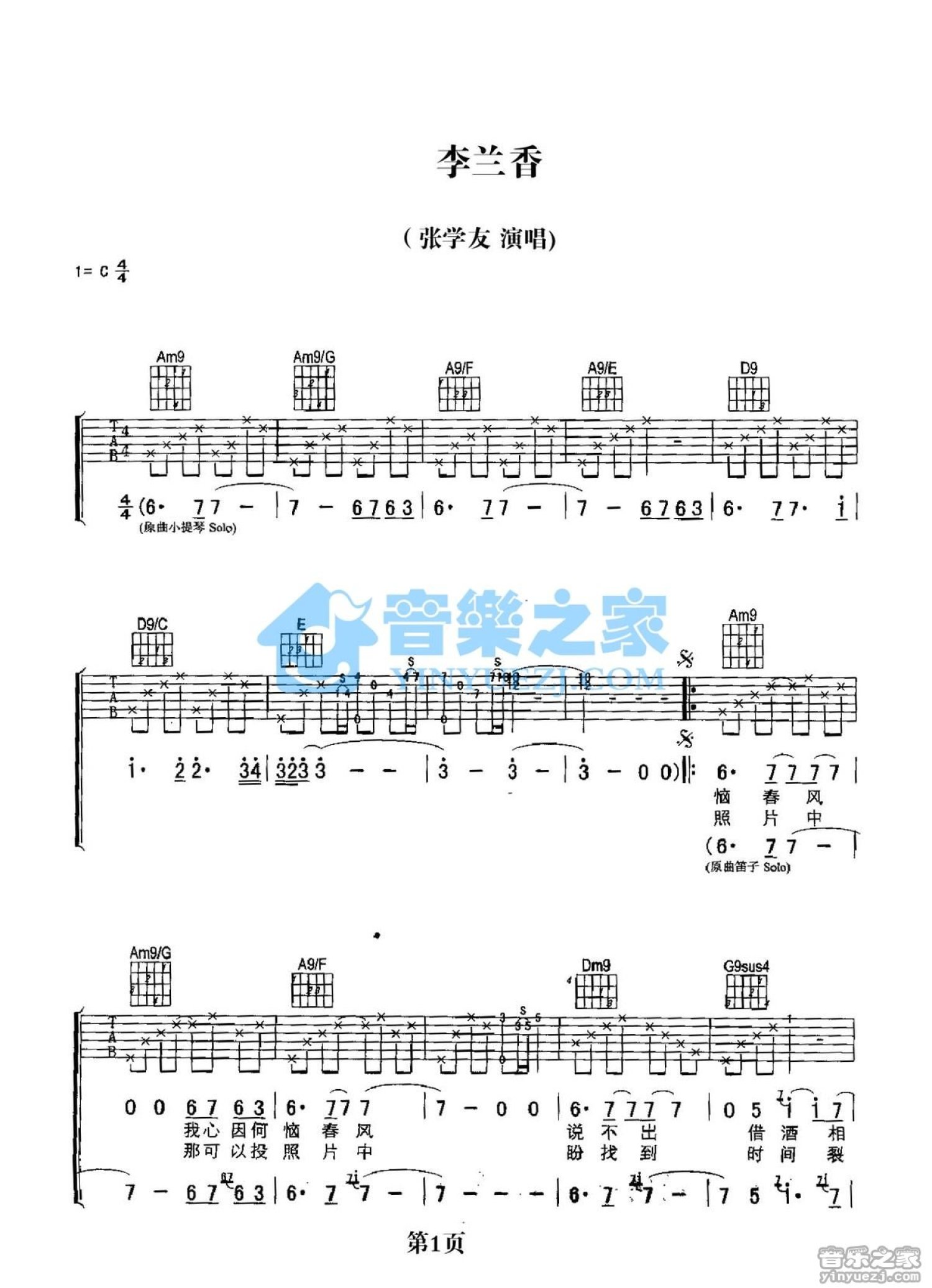 曲谱介绍: C调版《李兰香》吉他弹唱六线谱