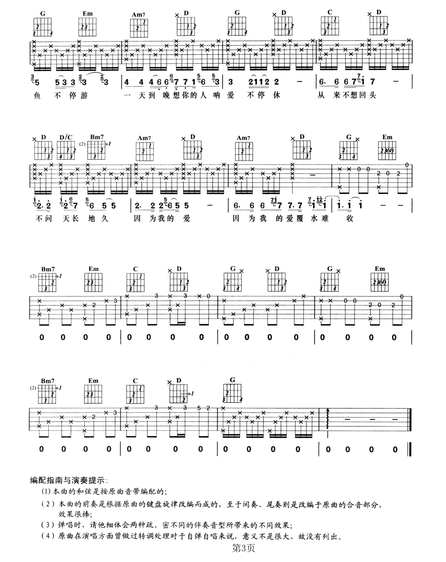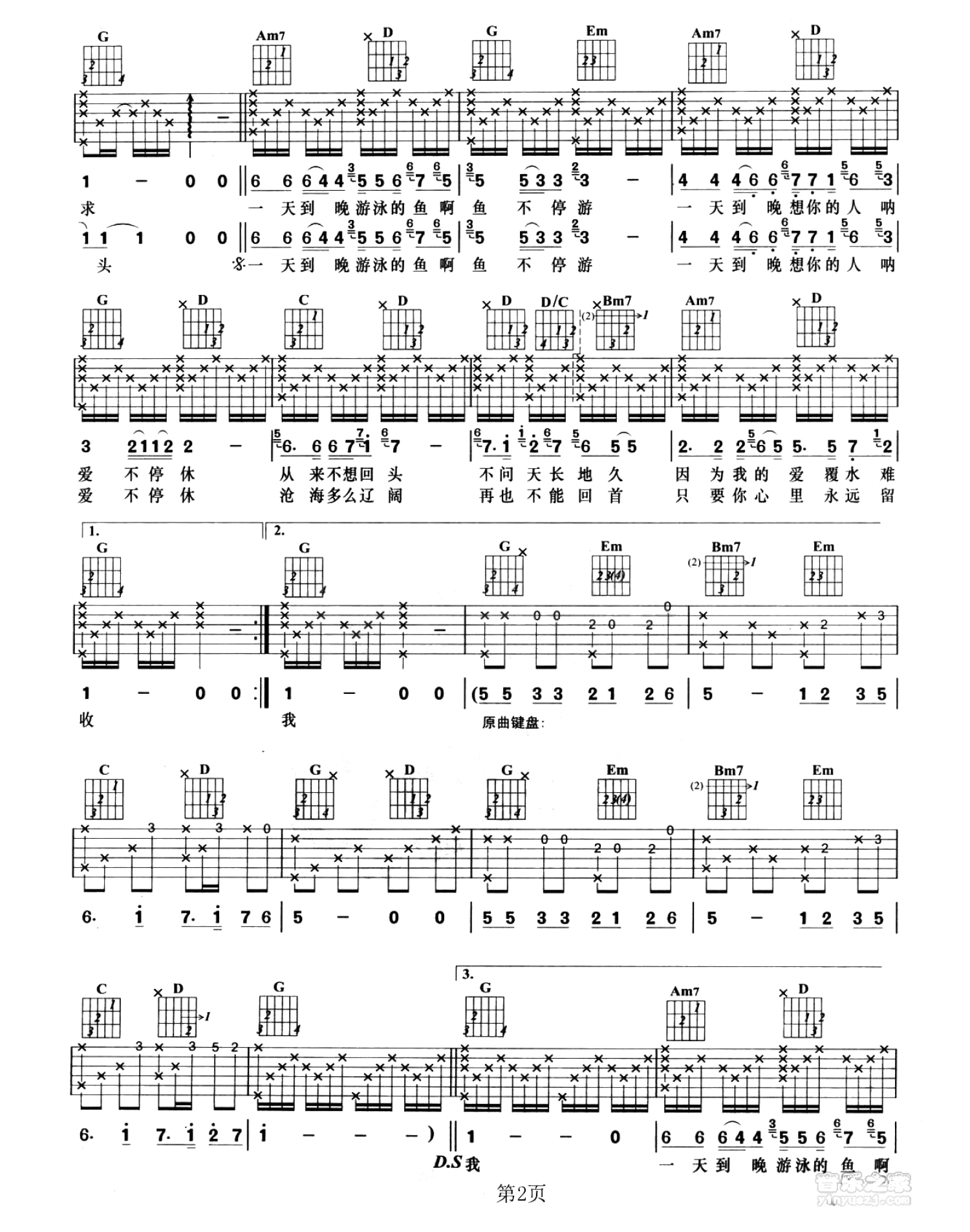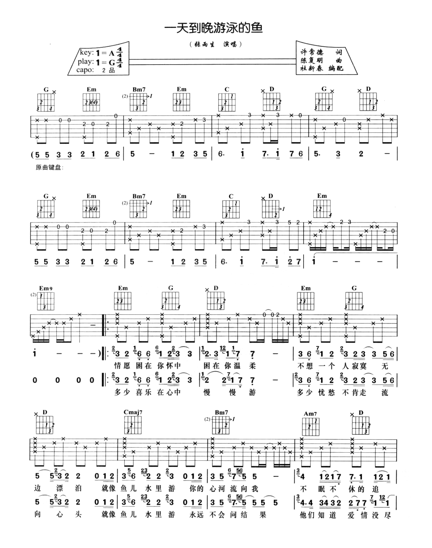曲谱介绍: G调版《一天到晚游泳的鱼》吉他弹唱六线谱