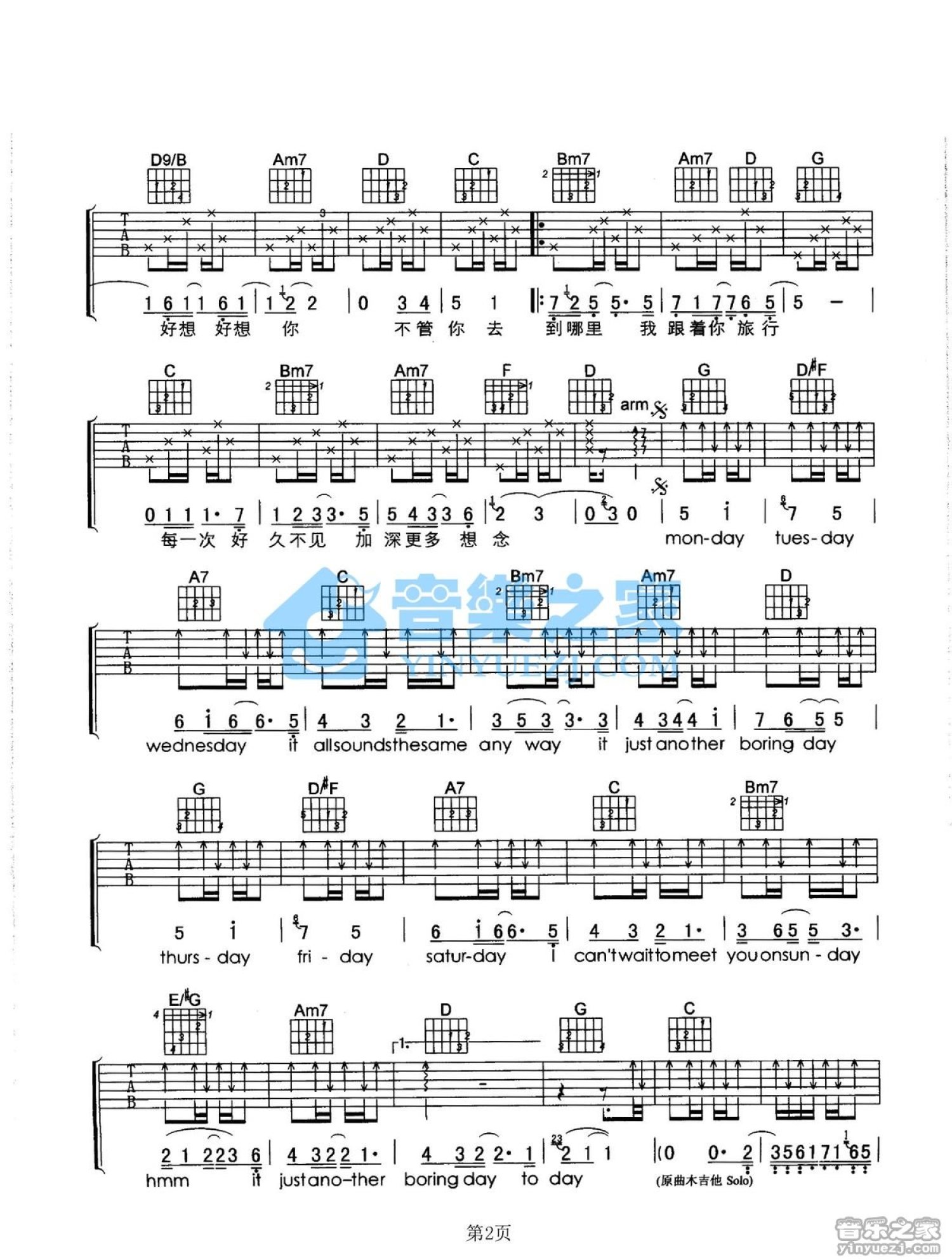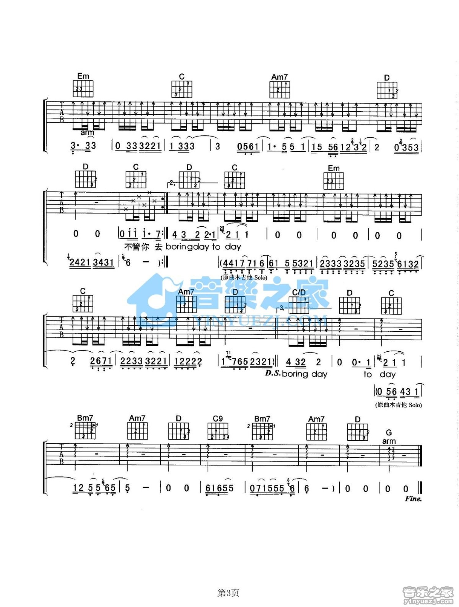 曲谱介绍: G调版《BoringDay》吉他弹唱六线谱