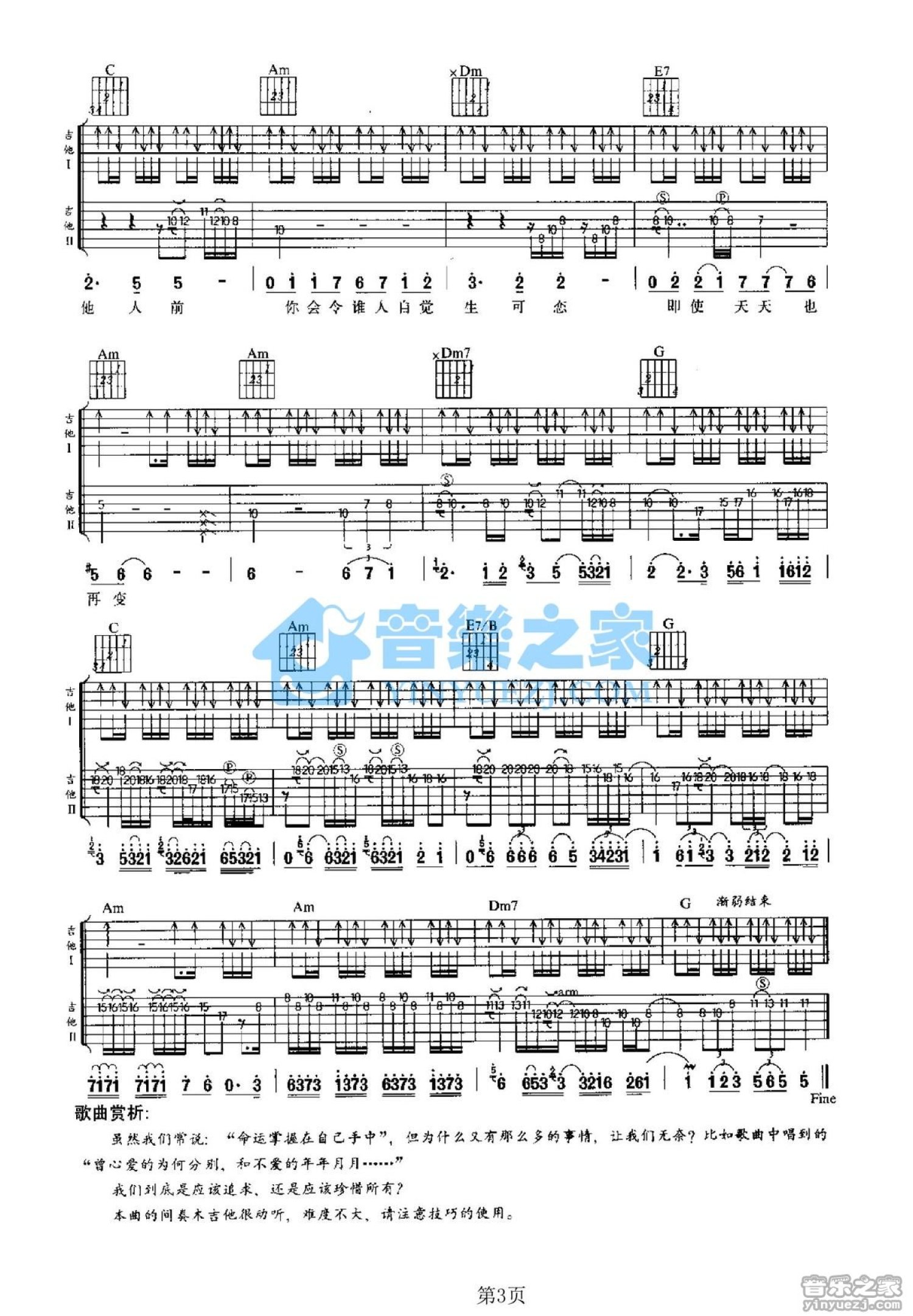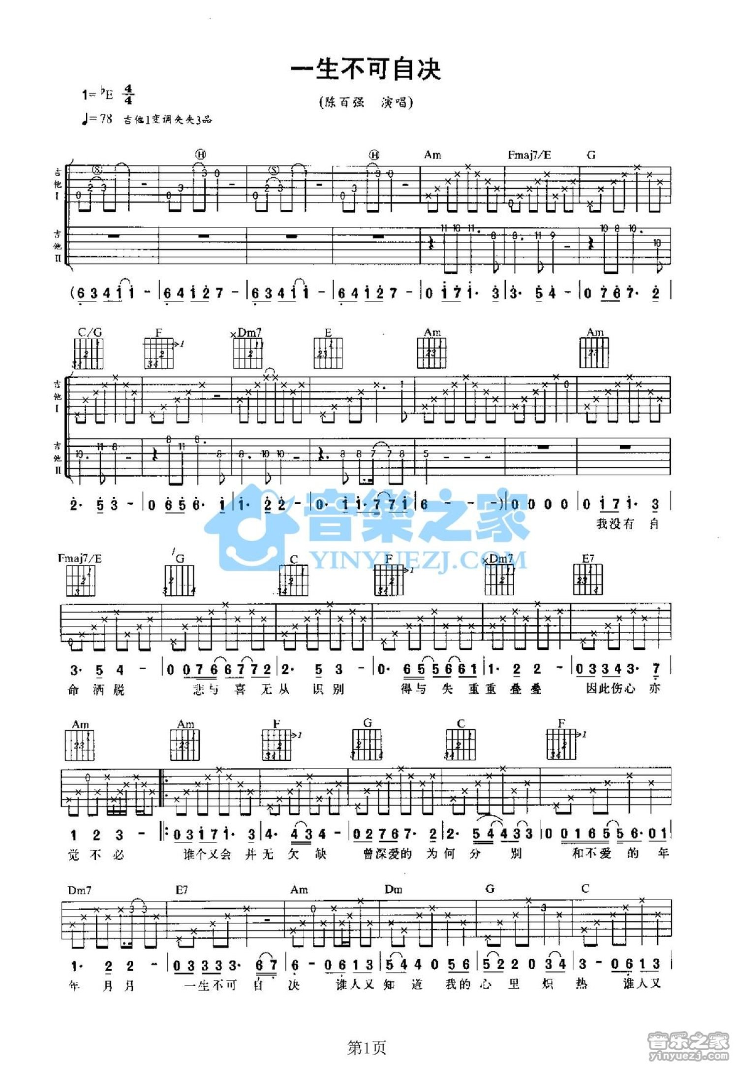 曲谱介绍: bE调《一生不可自决》吉他弹唱六线谱