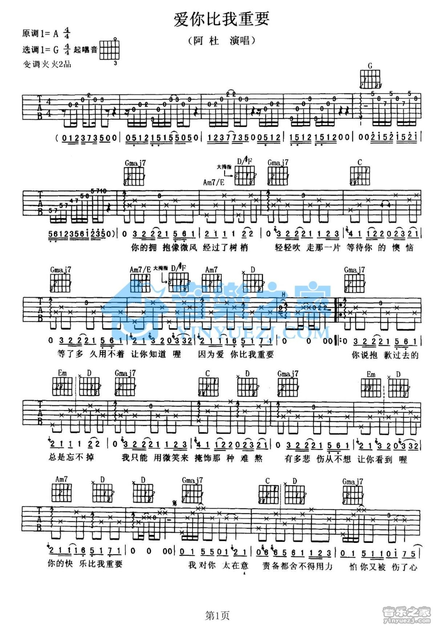 曲谱介绍: G调版《爱你比我重要》吉他弹唱六线谱