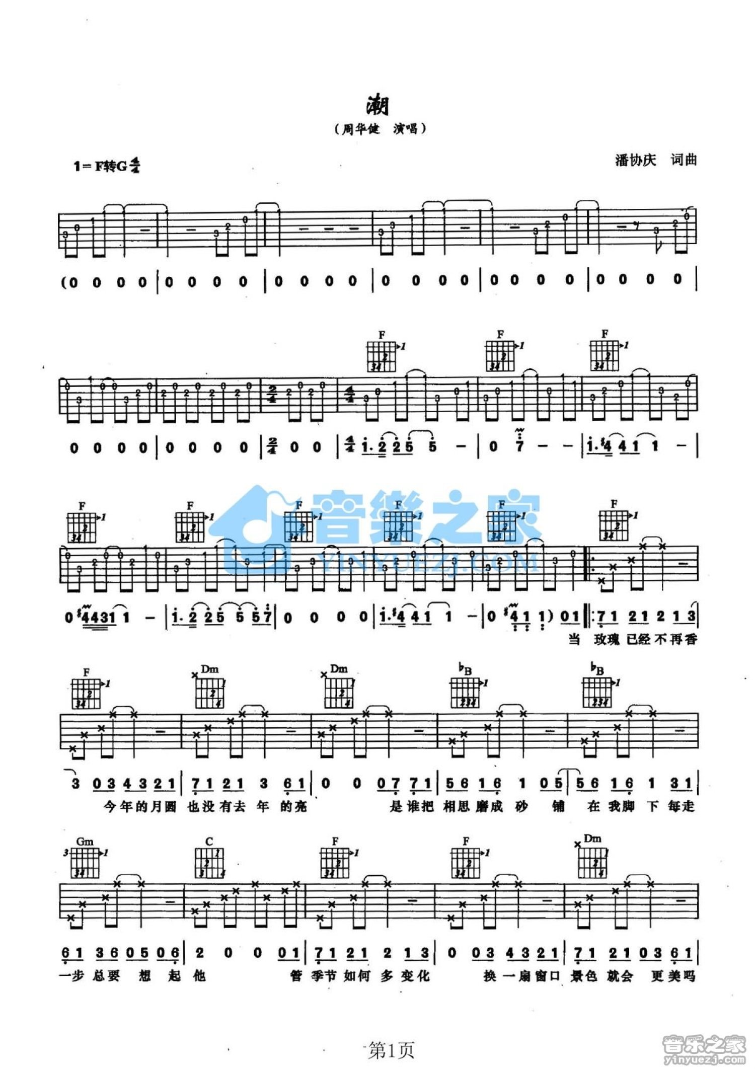 曲谱介绍: F转G调版《潮》吉他弹唱六线谱