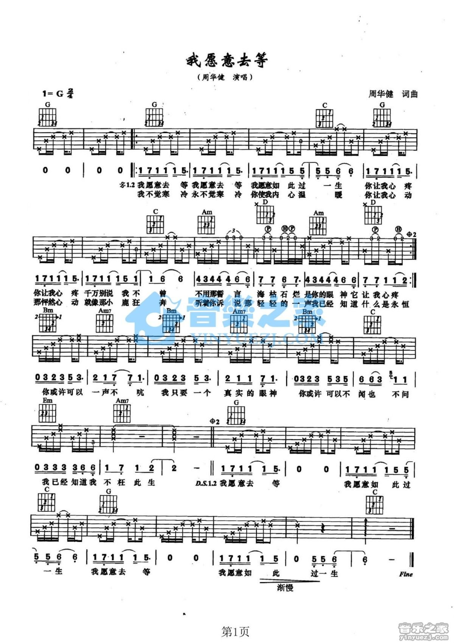 曲谱介绍: G调版《我愿意去等》吉他弹唱六线谱