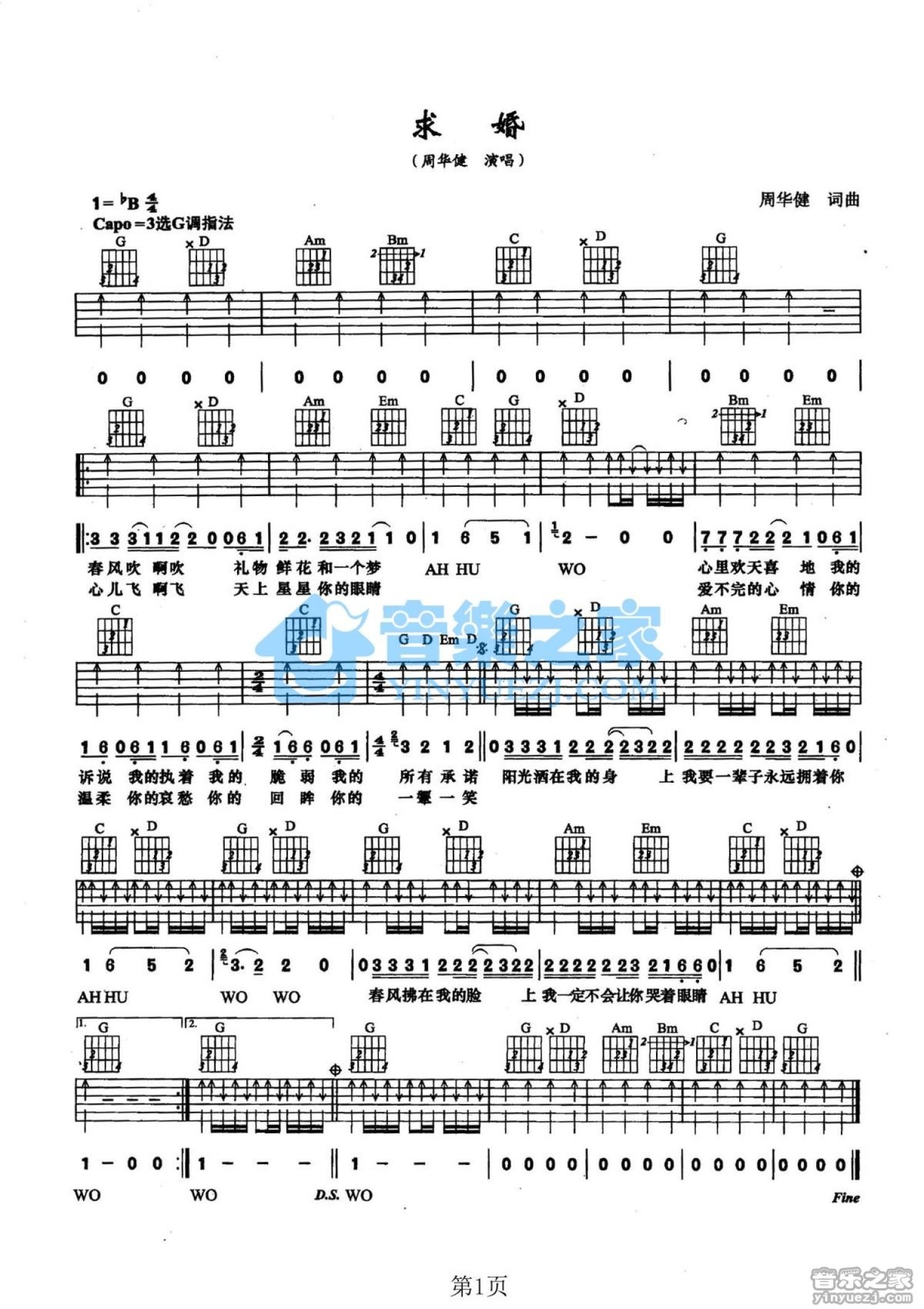 曲谱介绍: G调《求婚》吉他弹唱六线谱