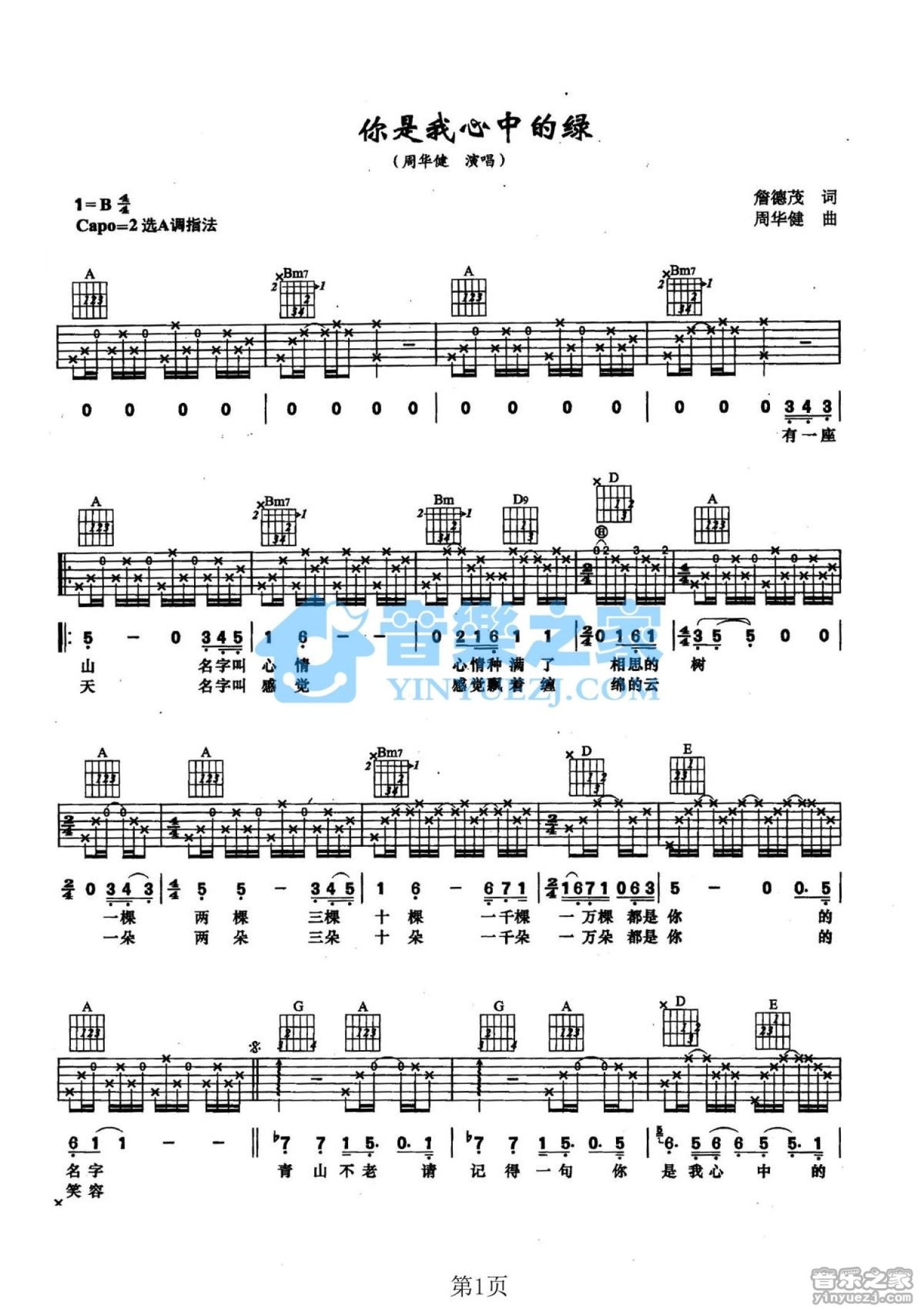 曲谱介绍: A调《你是我心中的绿》吉他弹唱六线谱