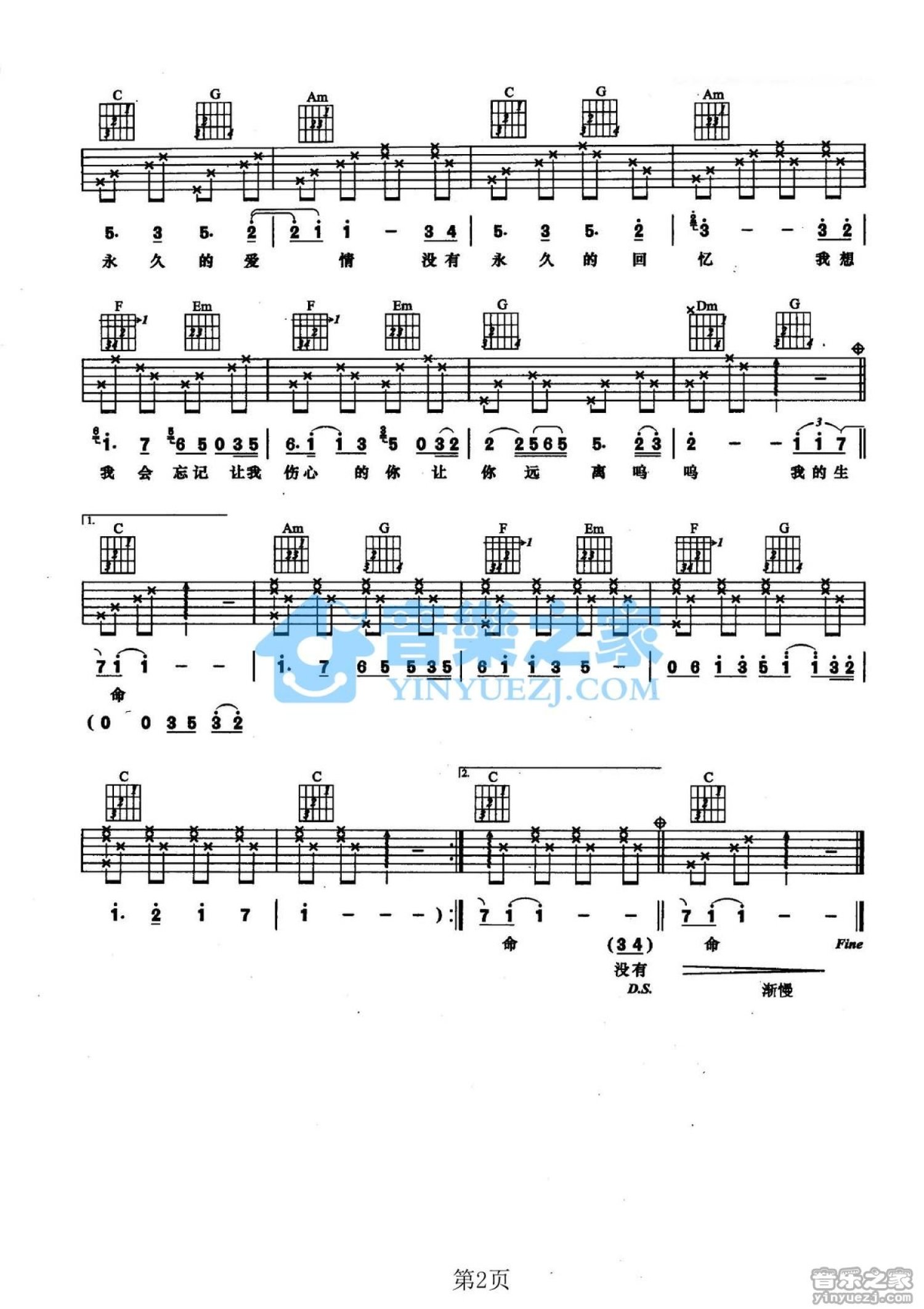 曲谱介绍: C调《没有永久的爱情》吉他弹唱六线谱