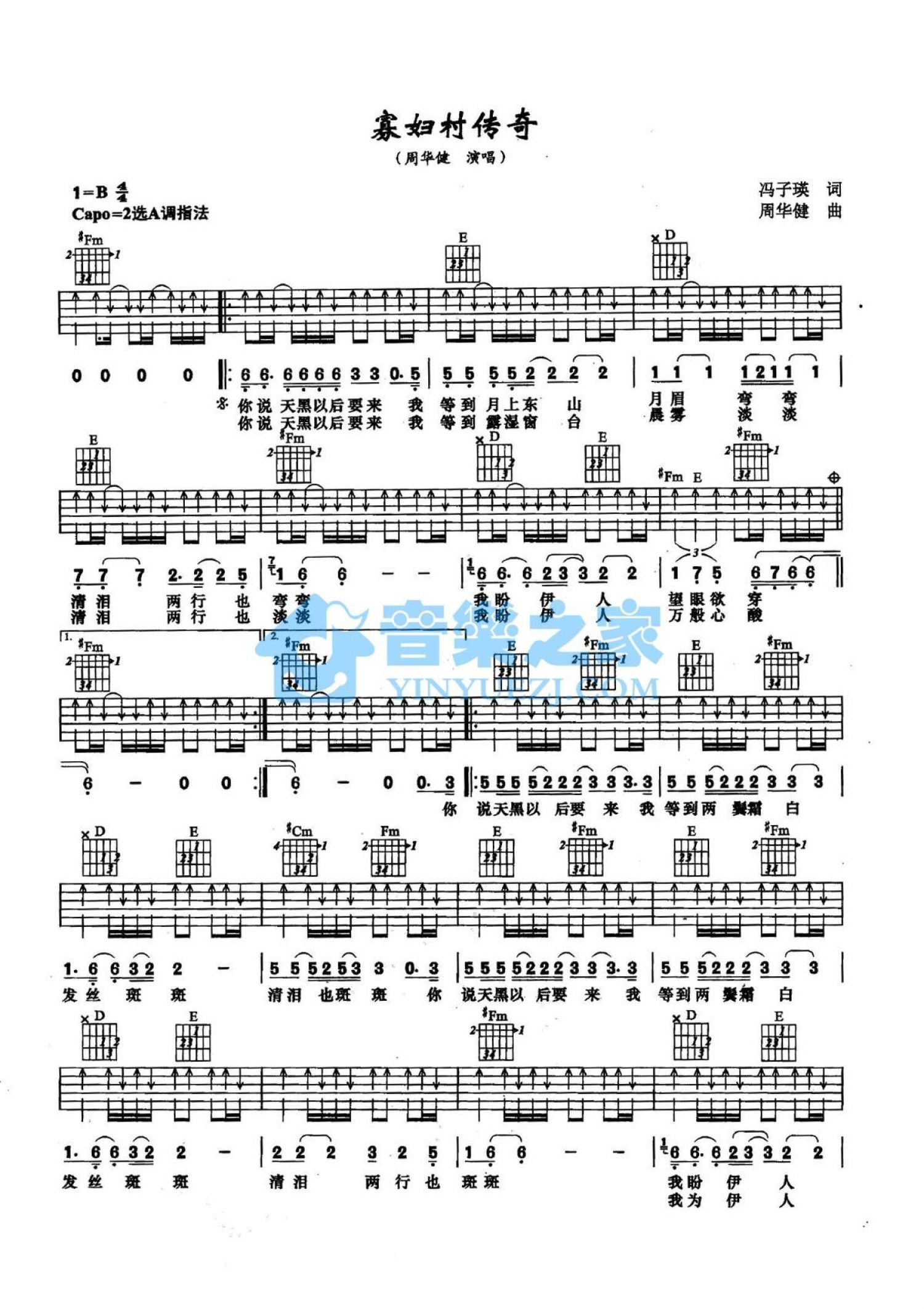 曲谱介绍: A调《寡妇村传奇》吉他弹唱六线谱