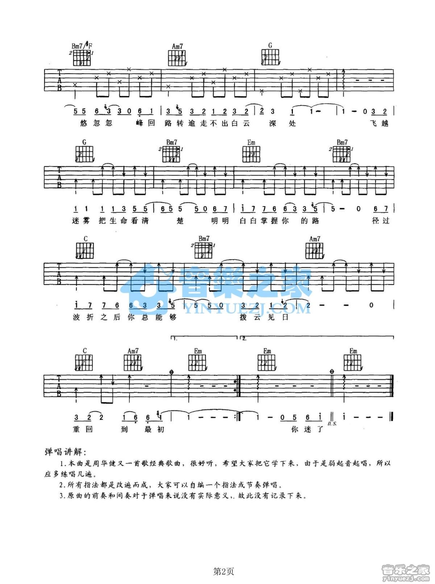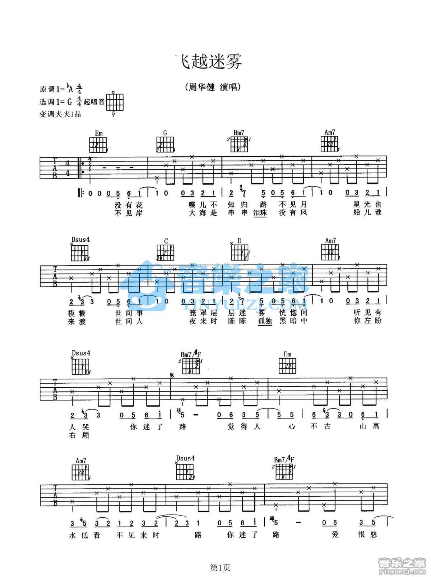 曲谱介绍: G调版《飞越迷雾》吉他弹唱六线谱