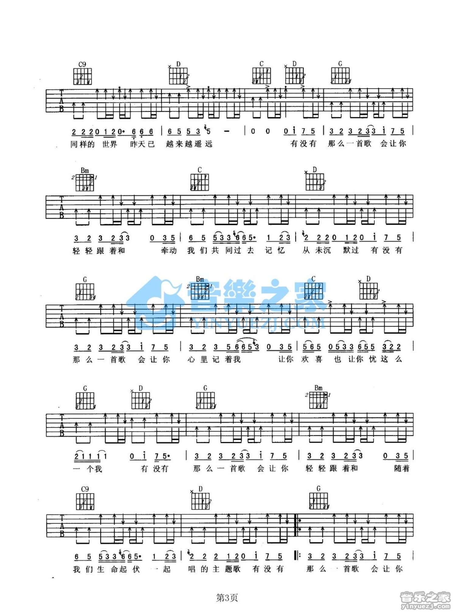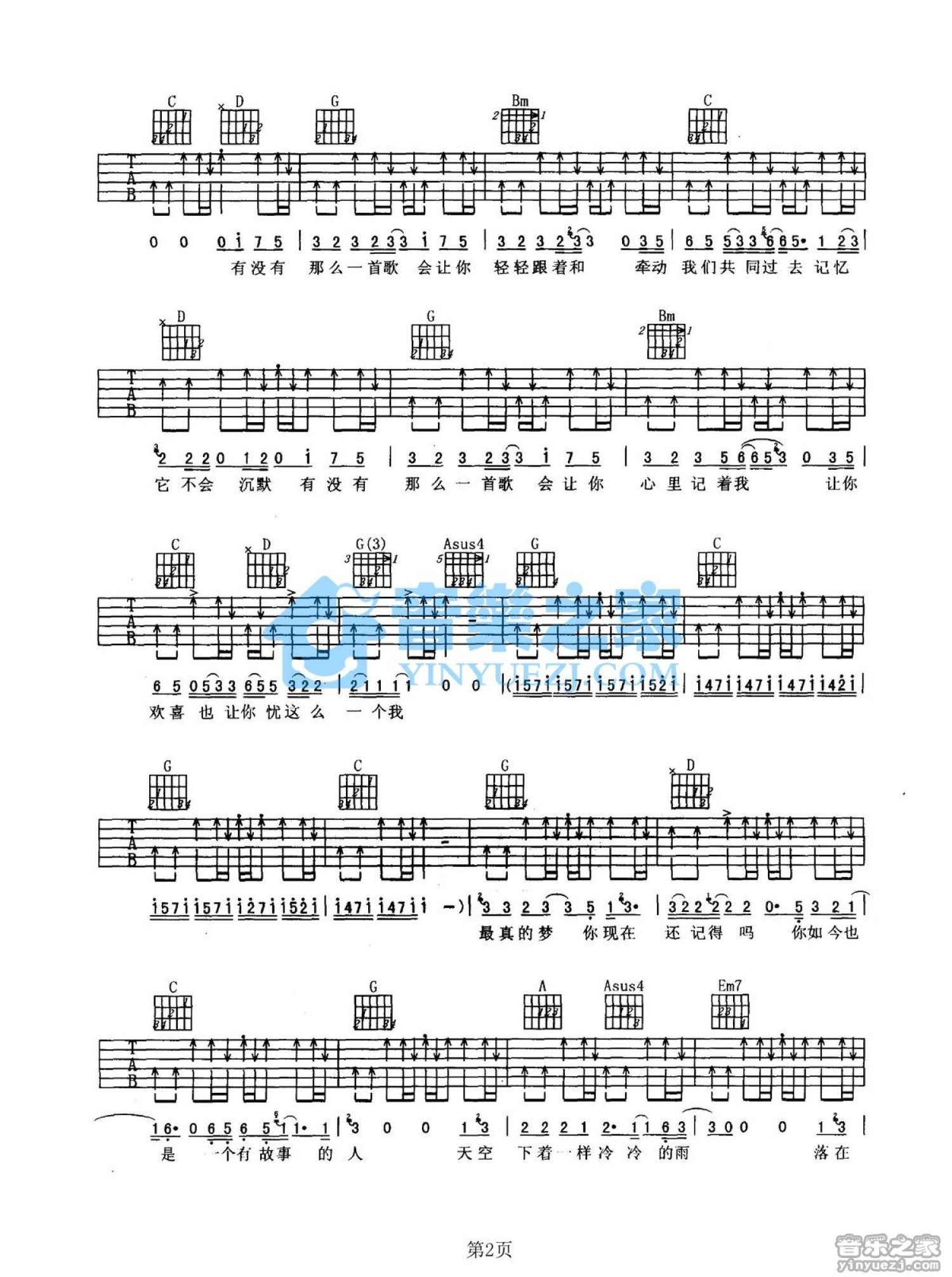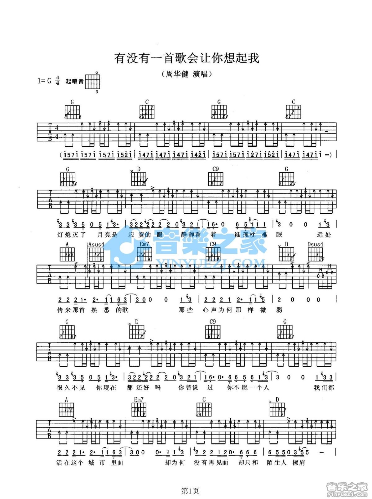 曲谱介绍: G调版《有没有一首歌会让我想起你》吉他弹唱六线谱
