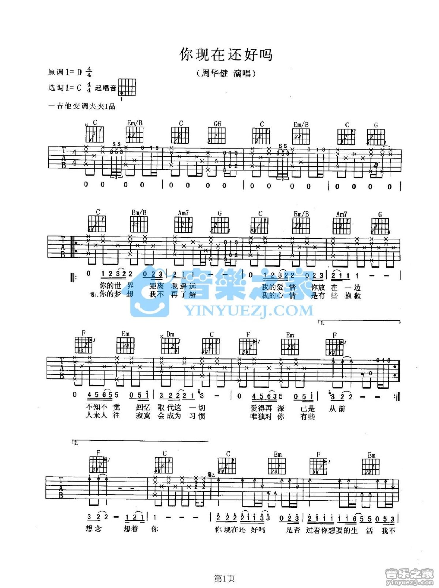 曲谱介绍: C调《你现在还好吗》吉他弹唱六线谱