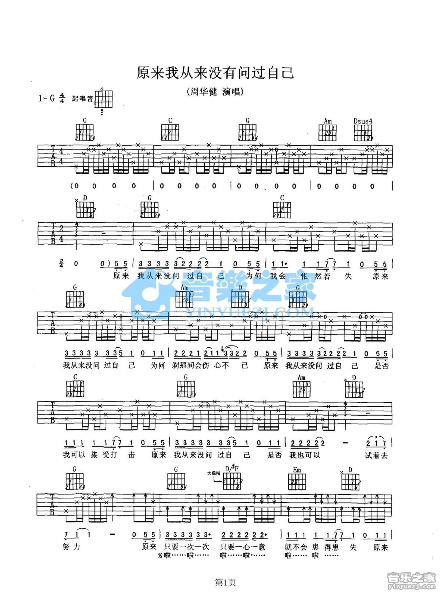 曲谱介绍: G调版《原来我从来没有问过自己》吉他弹唱六线谱