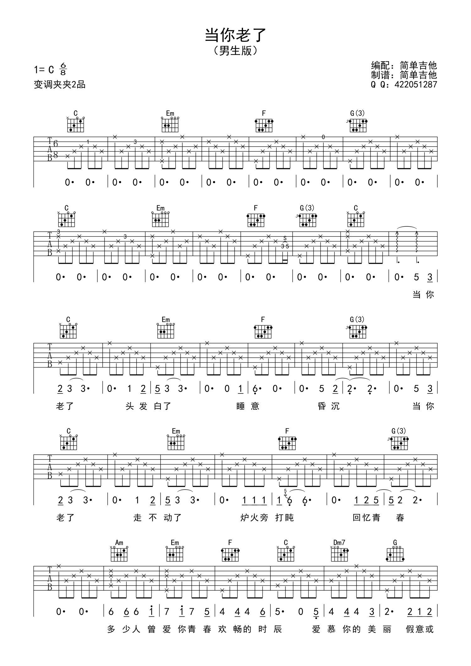 曲谱介绍: 赵照《当你老了》吉他谱,六线谱简单弹唱版本,选用C调弹奏变调夹夹第2品。根据叶芝名句改编的这首温暖的歌曲。唱出了很多子女对于母亲的心声。