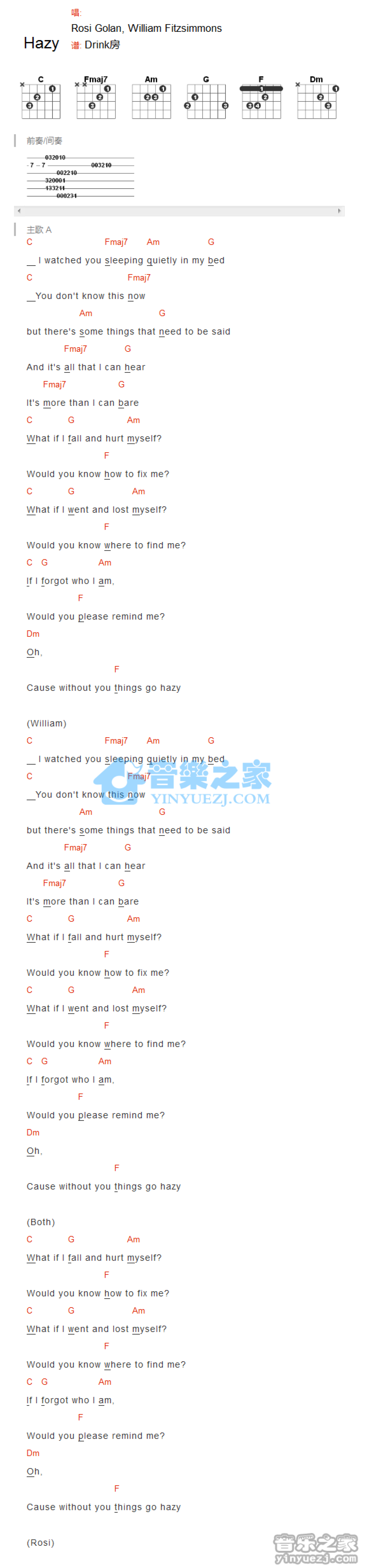 曲谱介绍: 《Hazy》吉他和弦弹唱谱