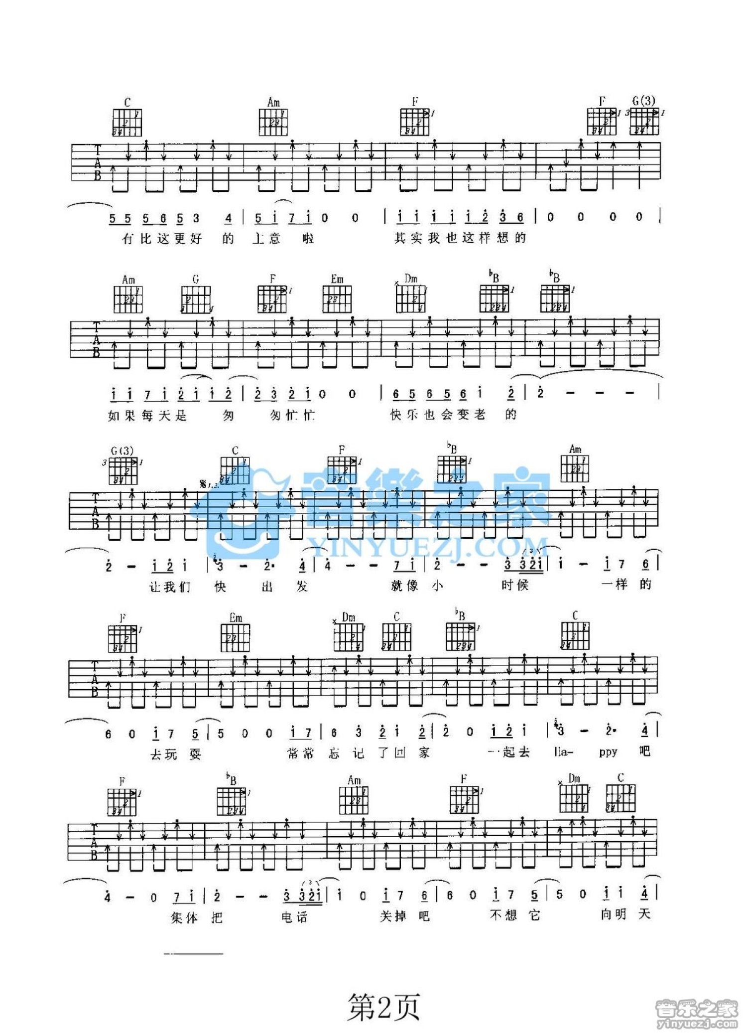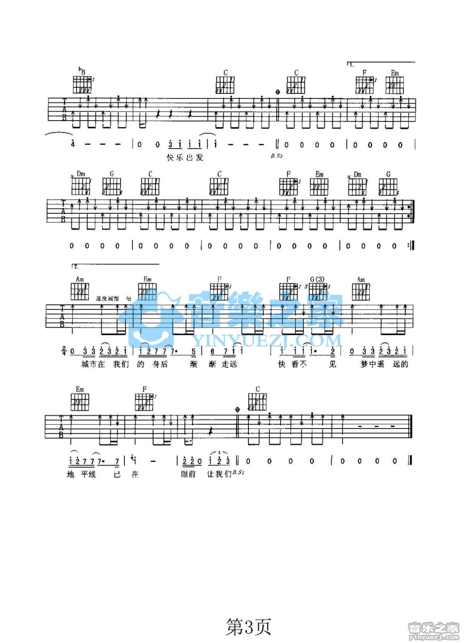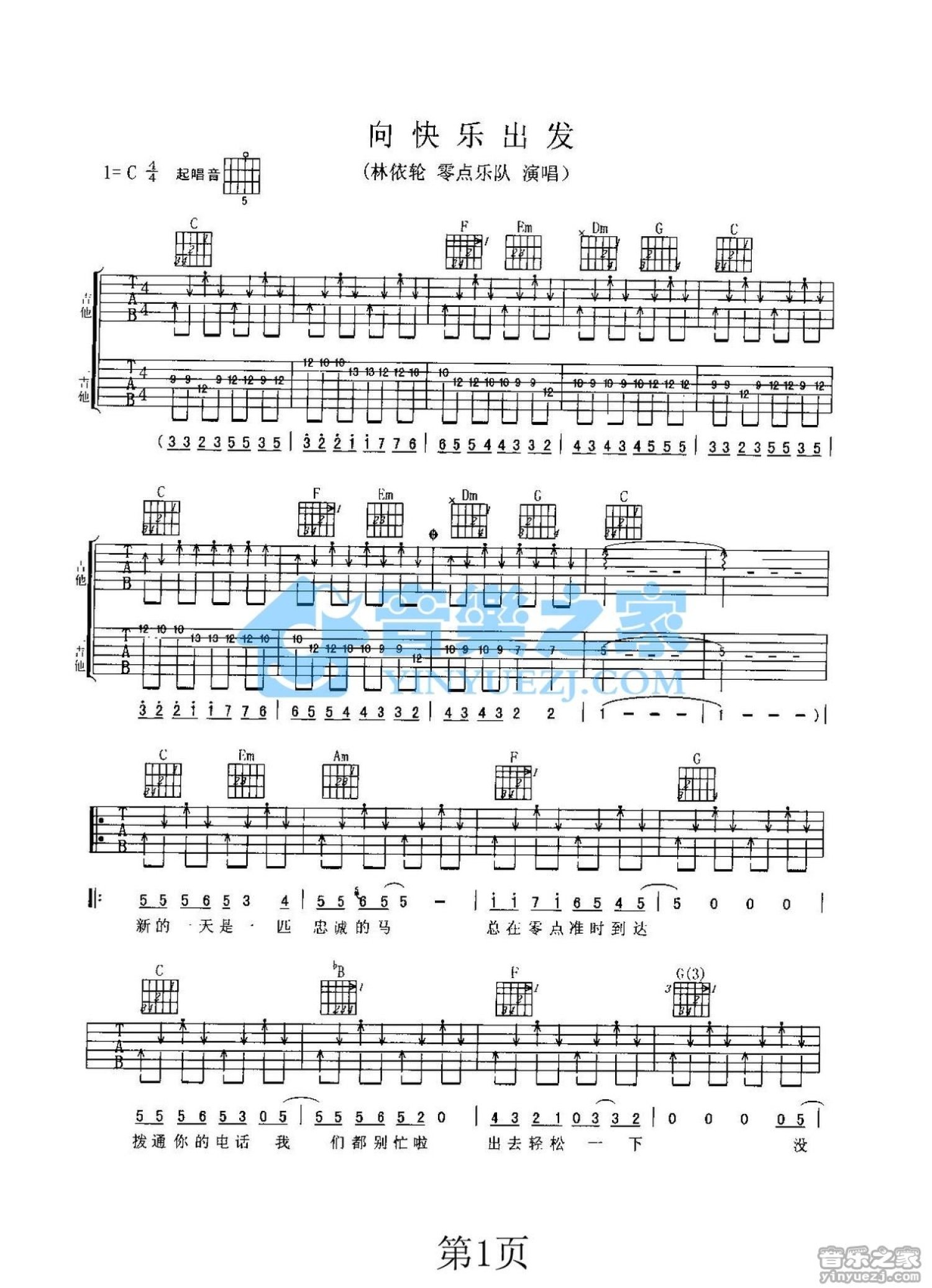 曲谱介绍: C调《向快乐出发》吉他弹唱六线谱