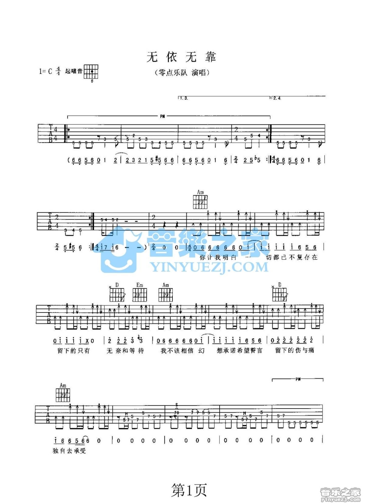 无依无靠吉他谱 - 零点乐队 - C调吉他弹唱谱 - 双吉他版