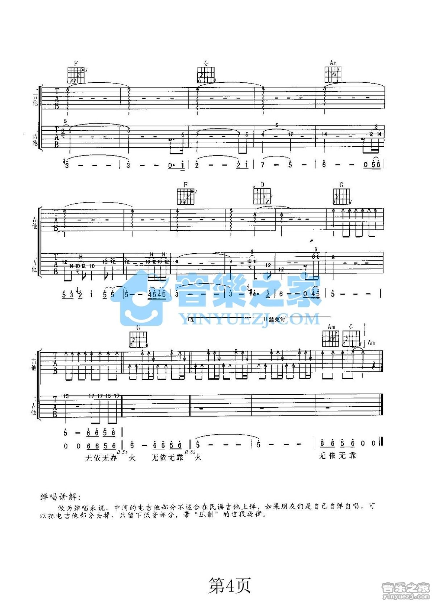 曲谱介绍: C调《无依无靠》吉他弹唱六线谱