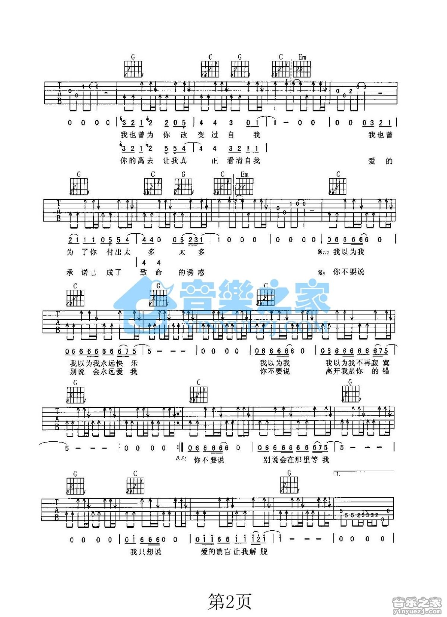 曲谱介绍: G调《爱的谎言》吉他弹唱六线谱