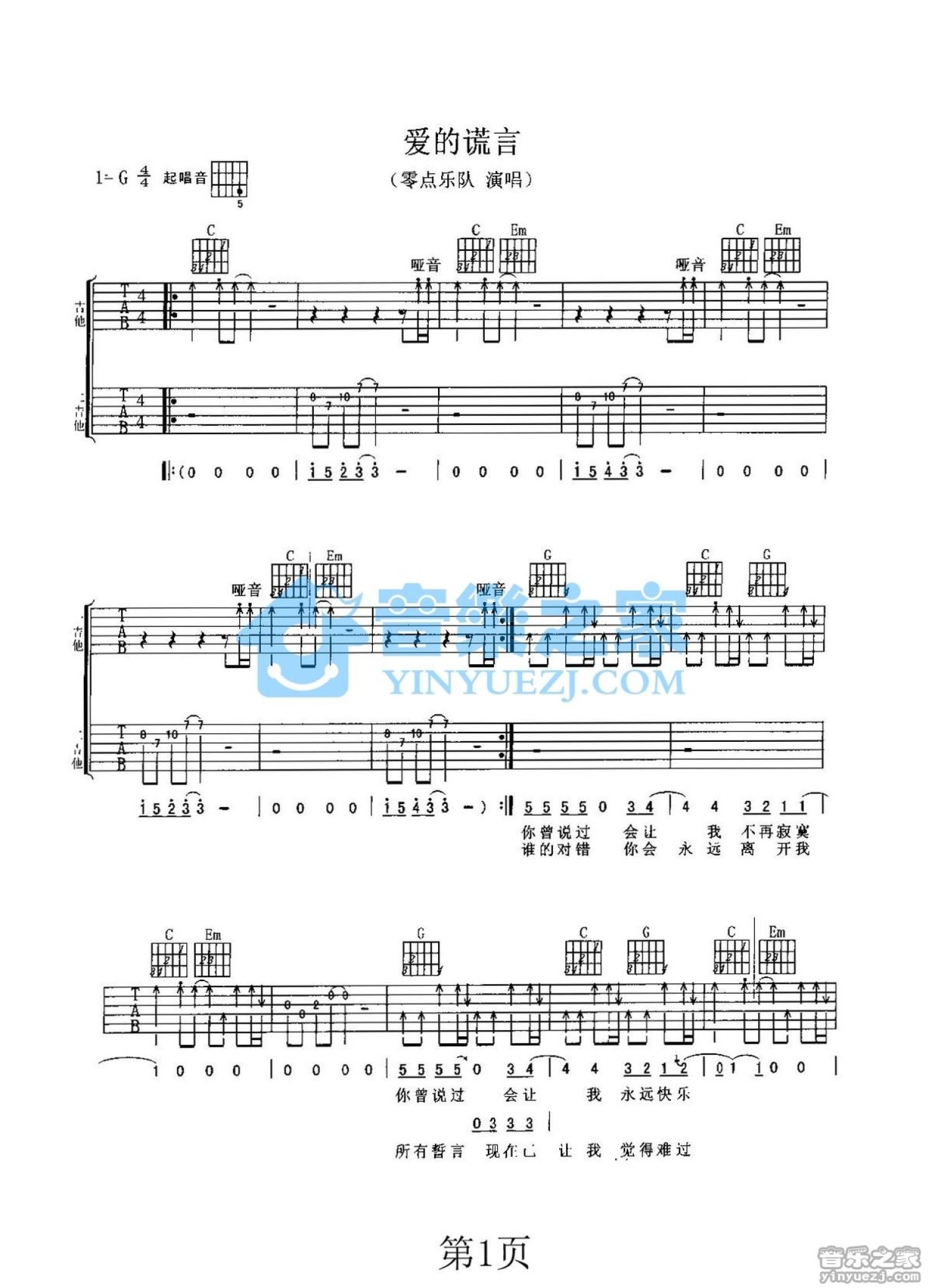 爱的谎言吉他谱 - 零点乐队 - G调吉他弹唱谱 - 双吉他版