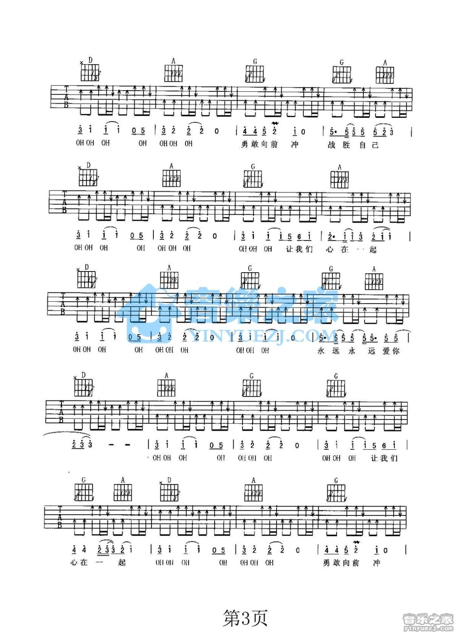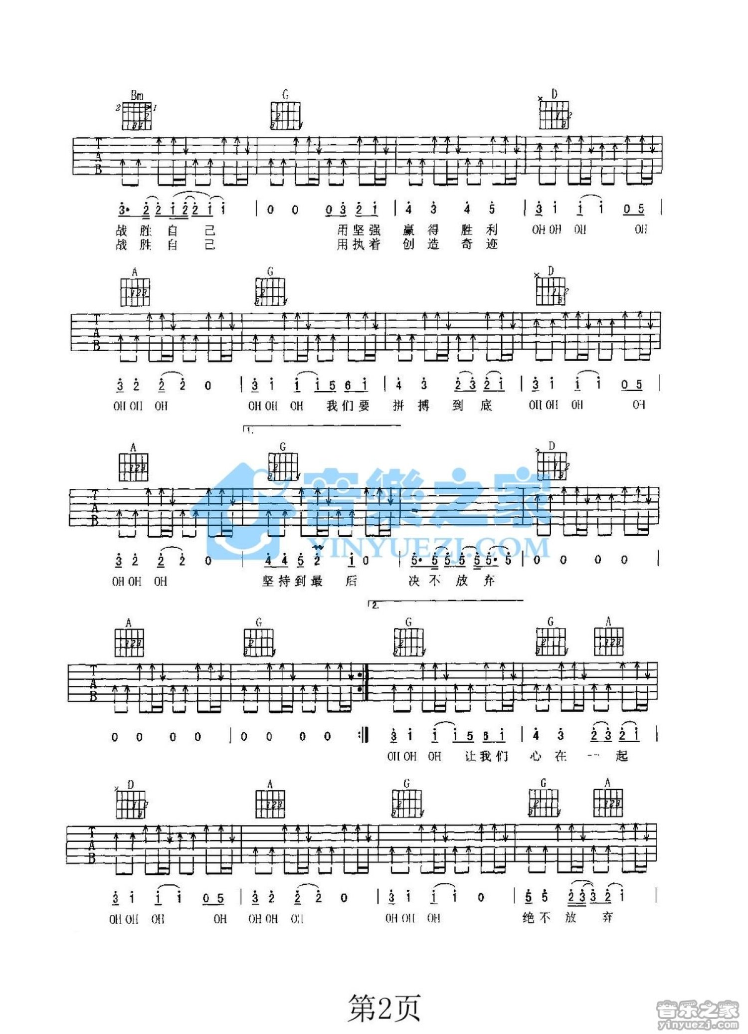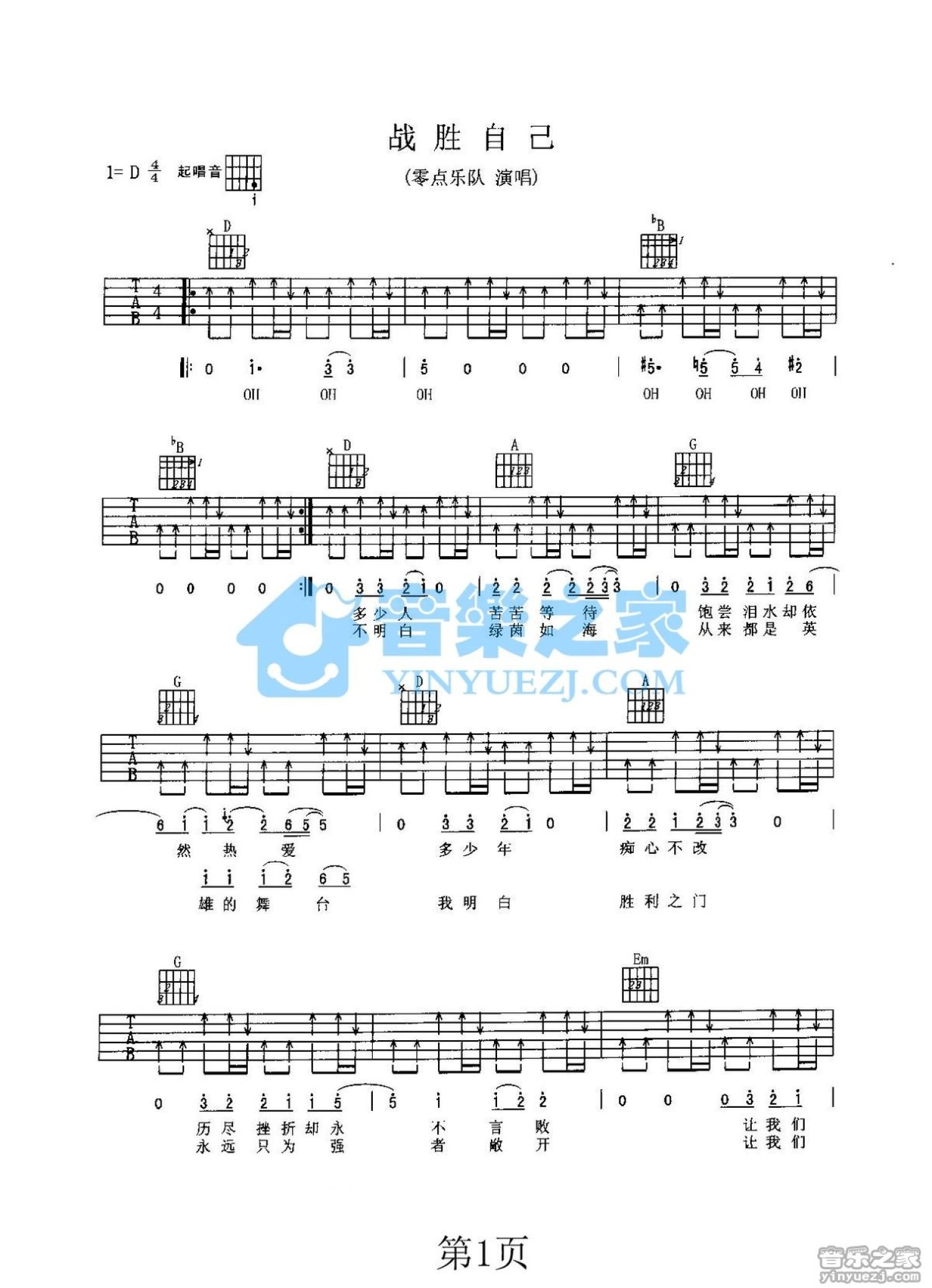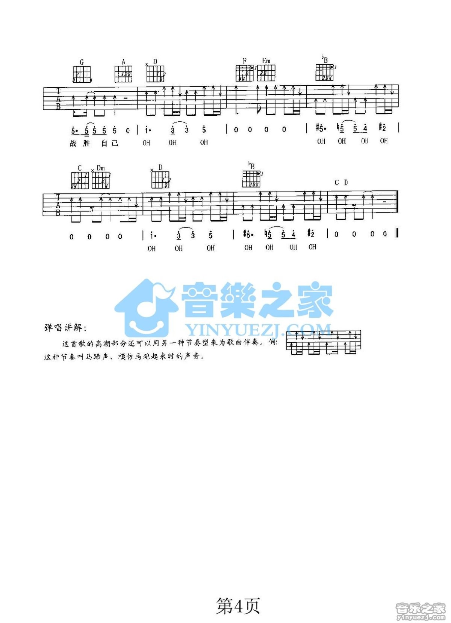 曲谱介绍: D调版《战胜自己》吉他弹唱六线谱