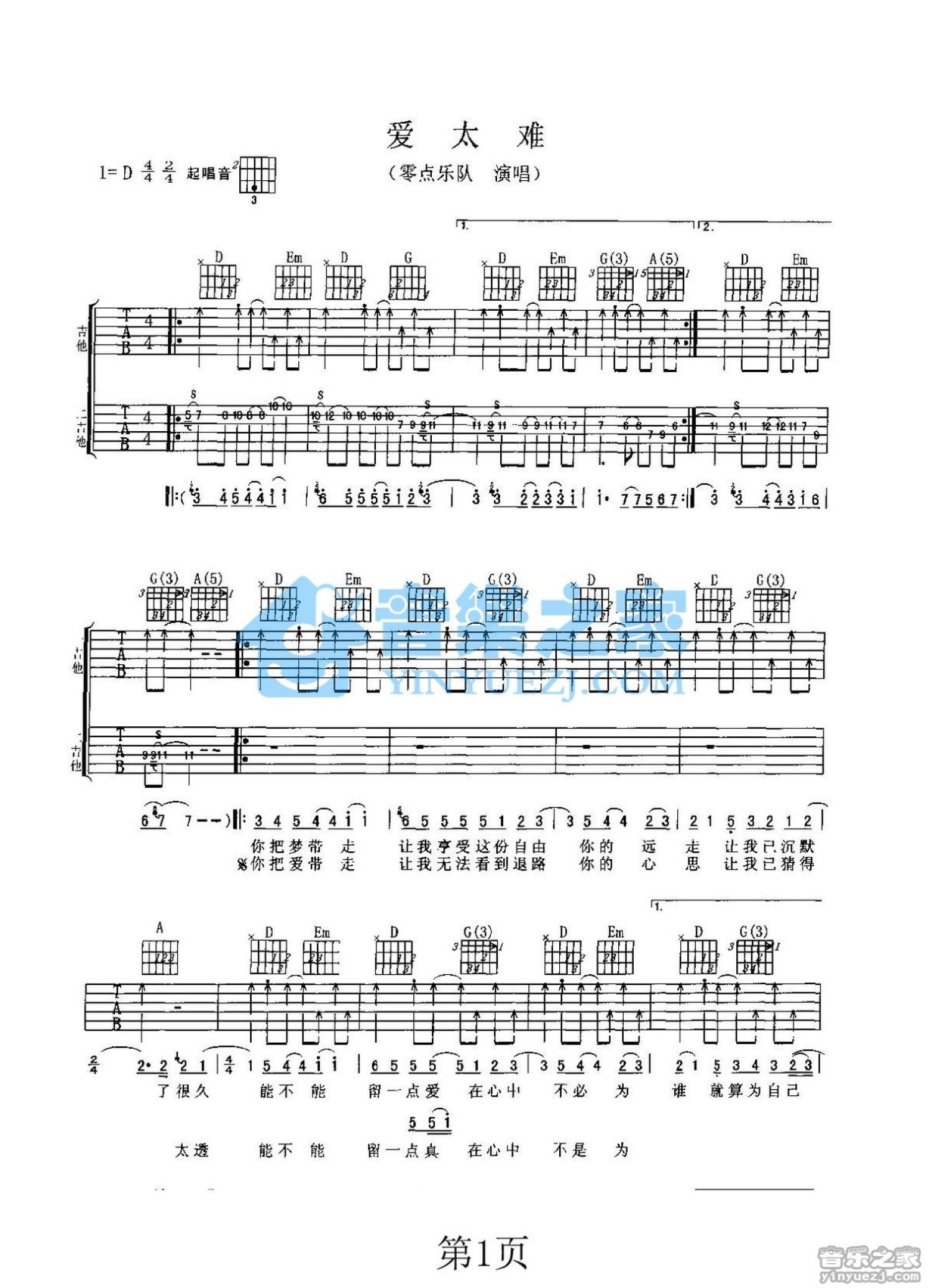 曲谱介绍: D调《爱太难》吉他弹唱六线谱