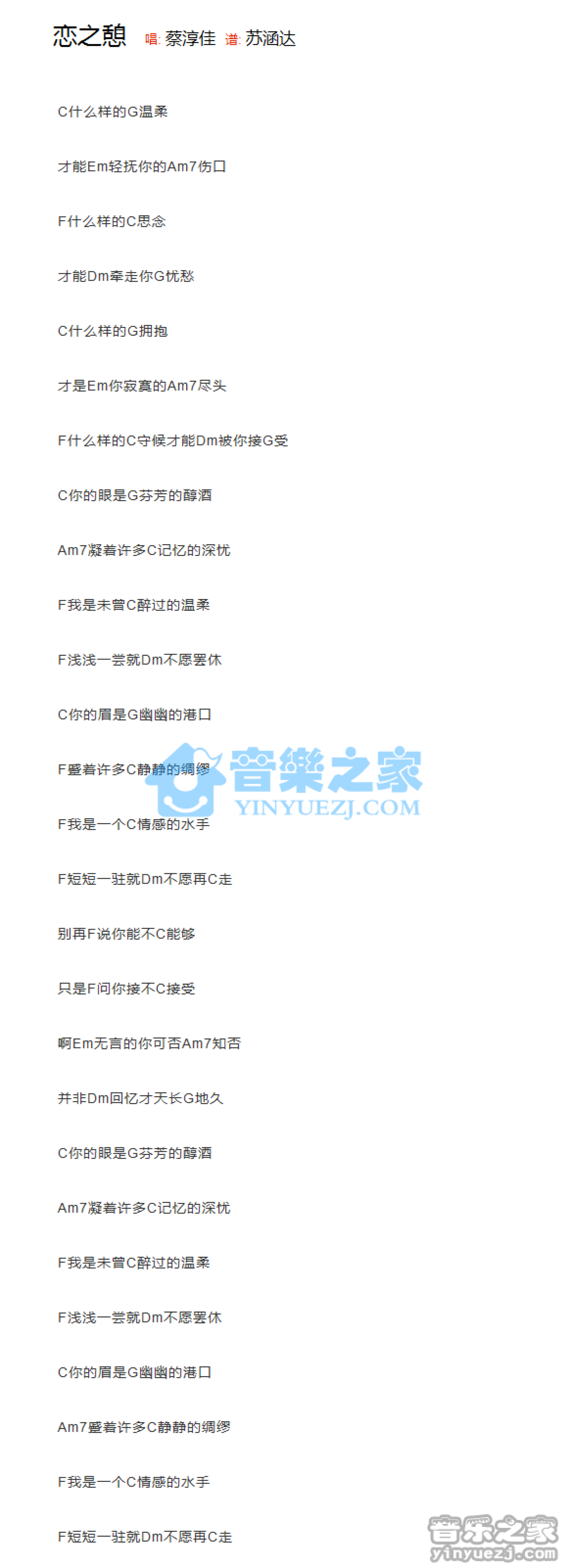 恋之憩吉他谱 - 蔡淳佳 - C调吉他弹唱谱 - 和弦谱