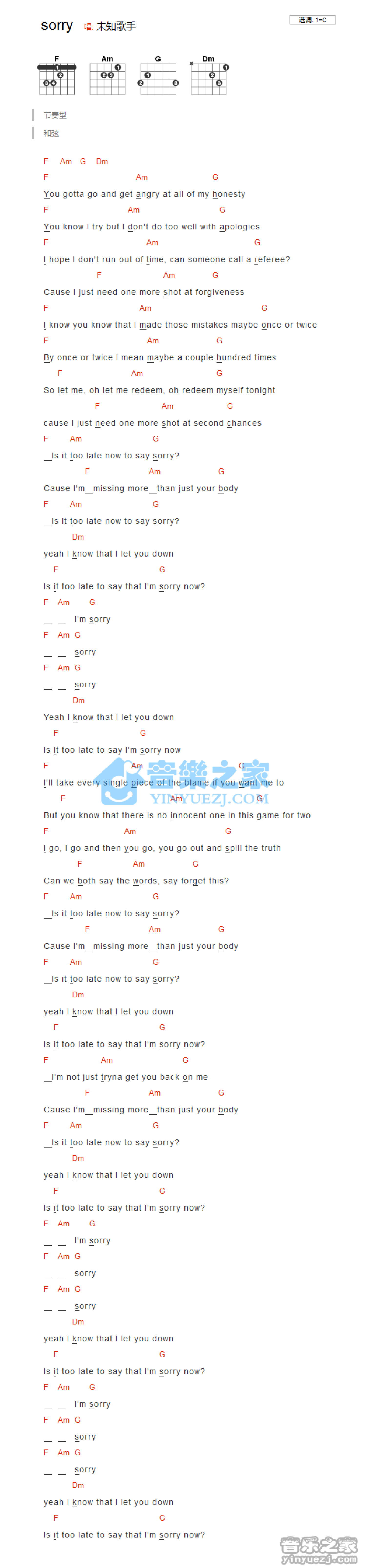 Sorry吉他谱 - JustinBieber - C调吉他弹唱谱 - 和弦谱