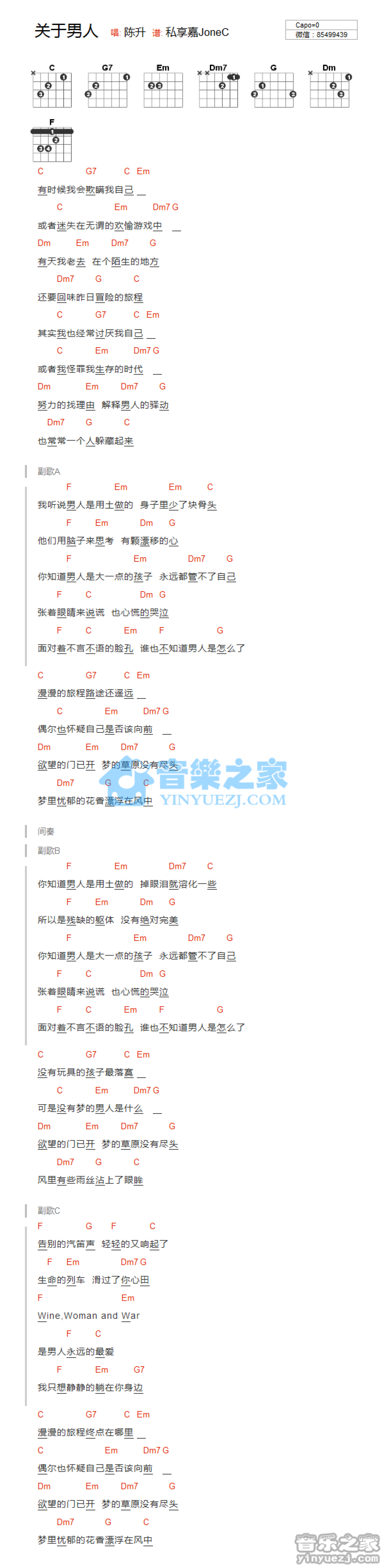 关于男人吉他谱 - 陈升 - C调吉他弹唱谱 - 和弦谱