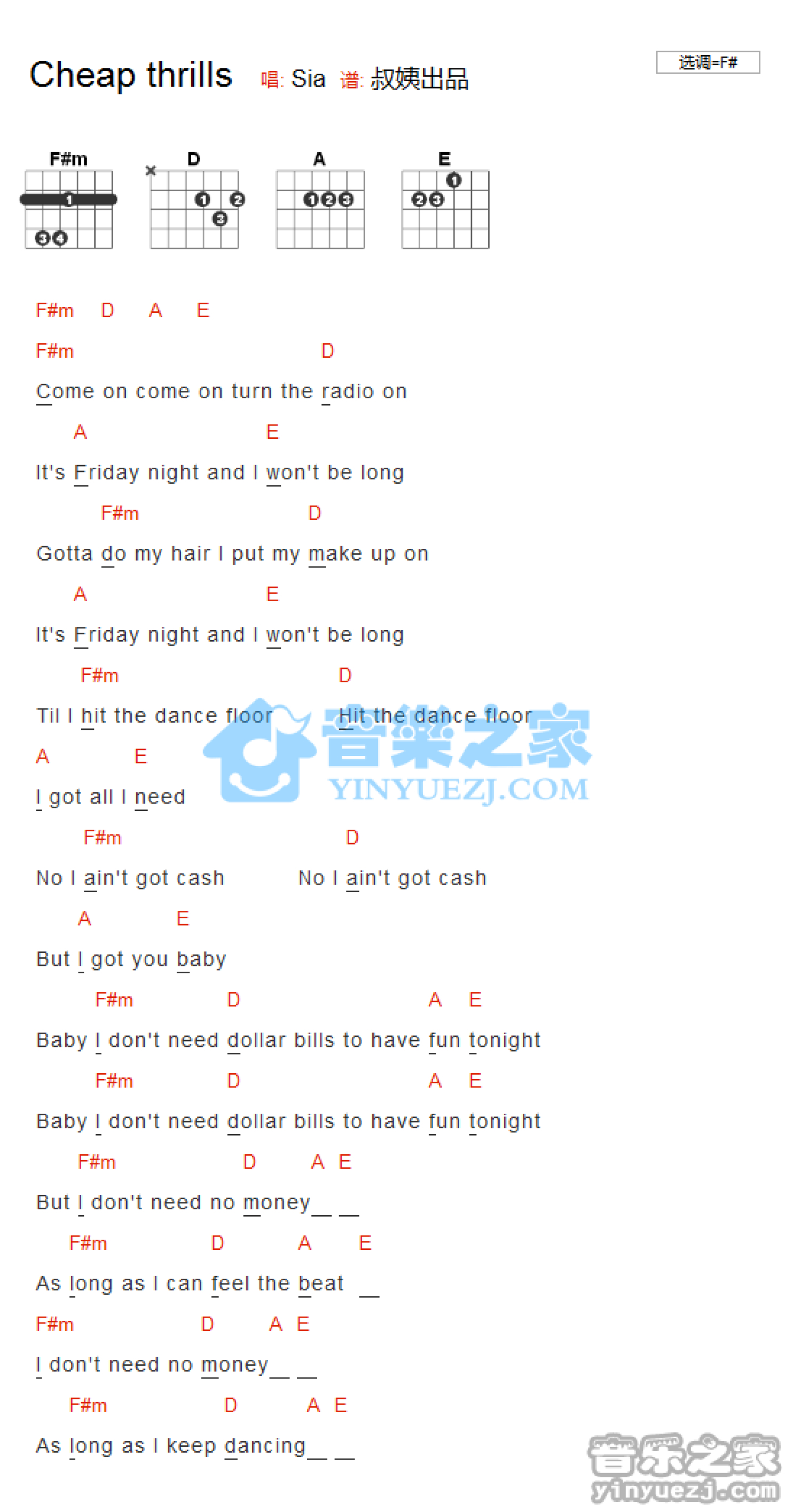 曲谱介绍: #F调版《CheapThrills》吉他和弦弹唱谱