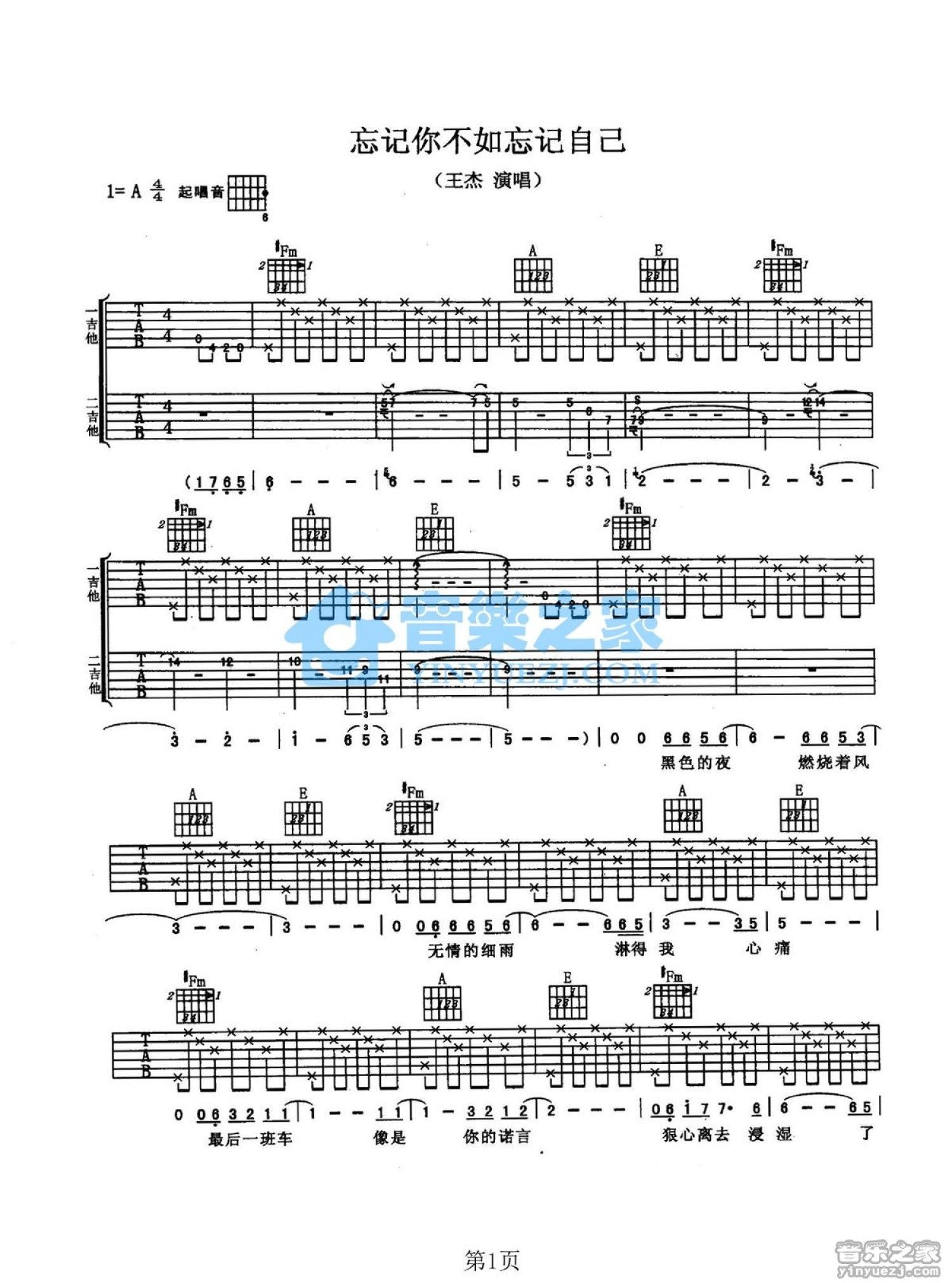 忘记你不如忘记自己吉他谱 - 王杰 - A调吉他弹唱谱 - 双吉他原版
