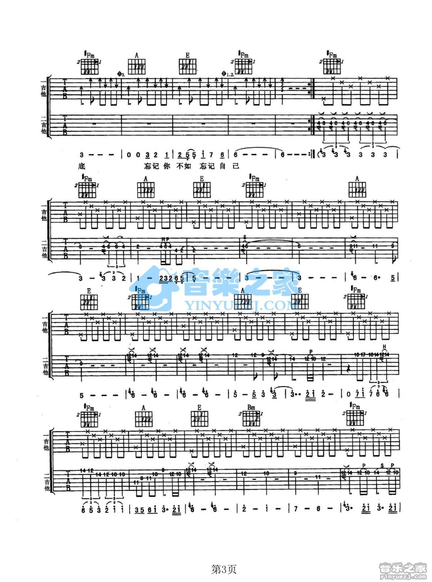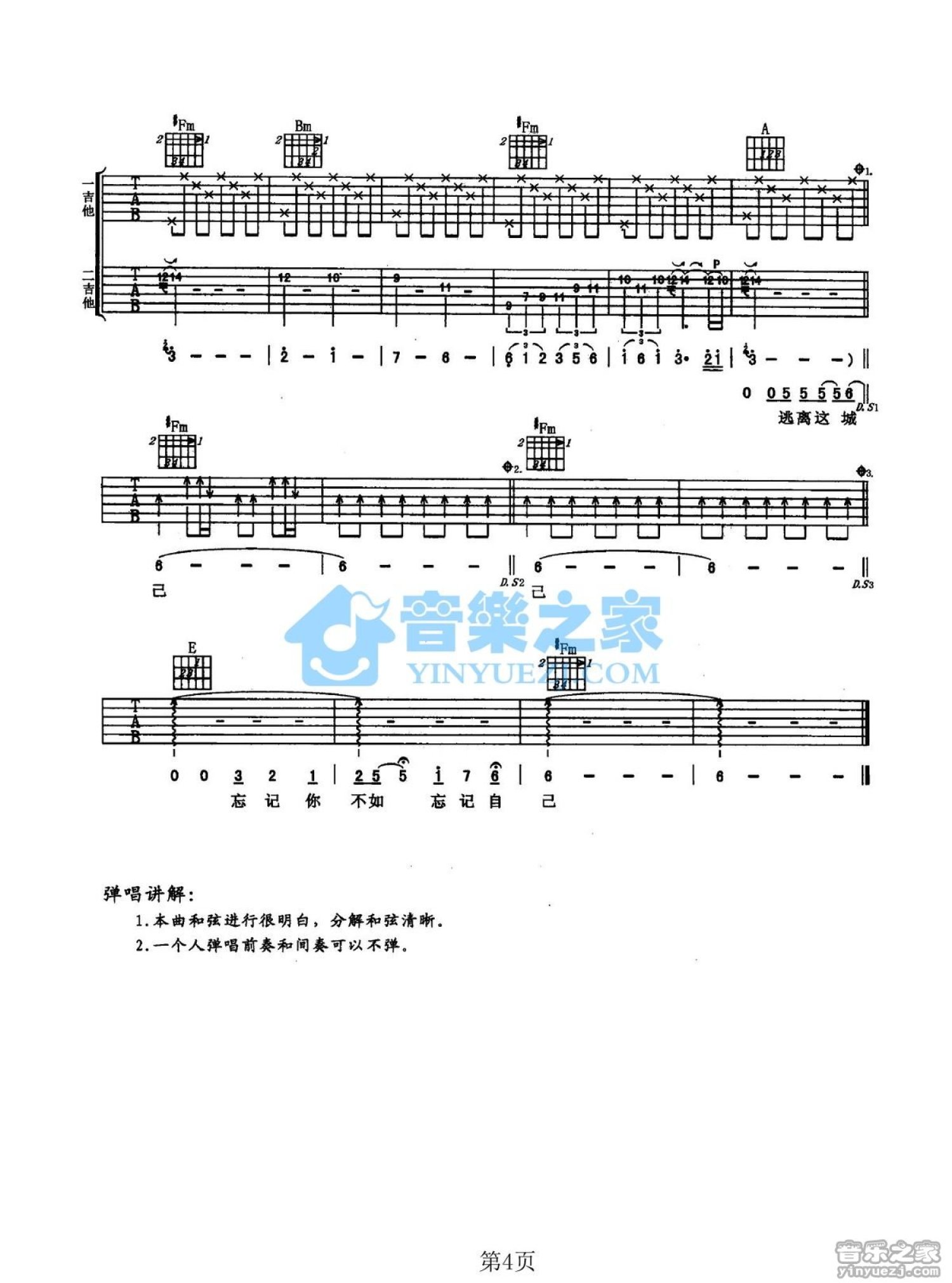 曲谱介绍: A调《忘记你不如忘记自己》吉他弹唱六线谱