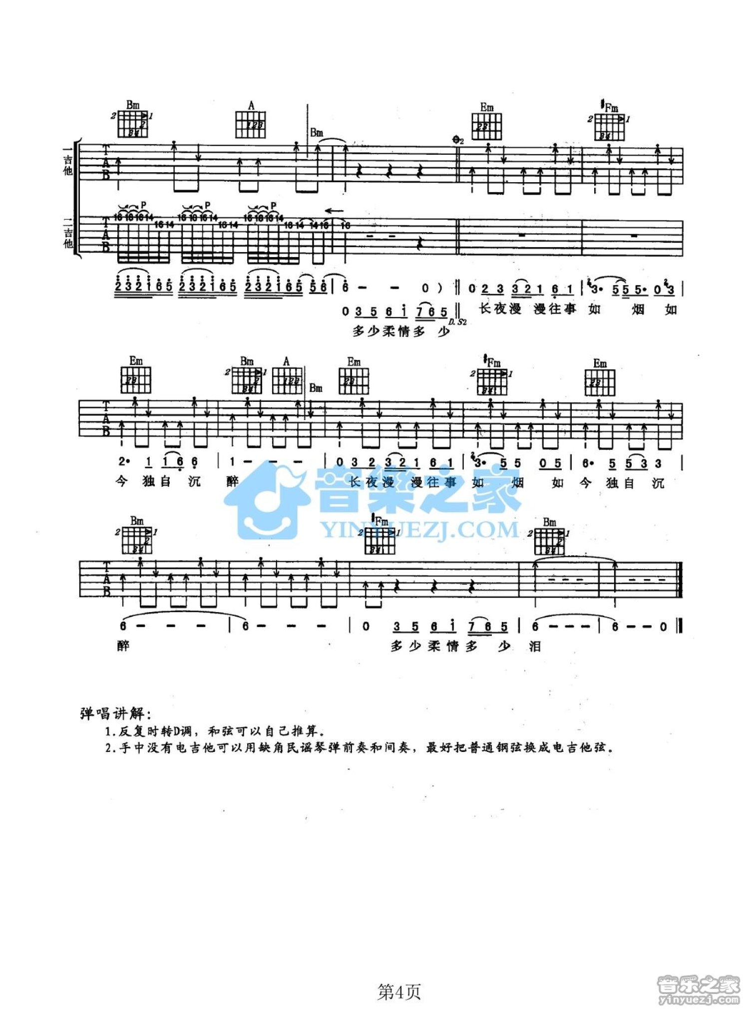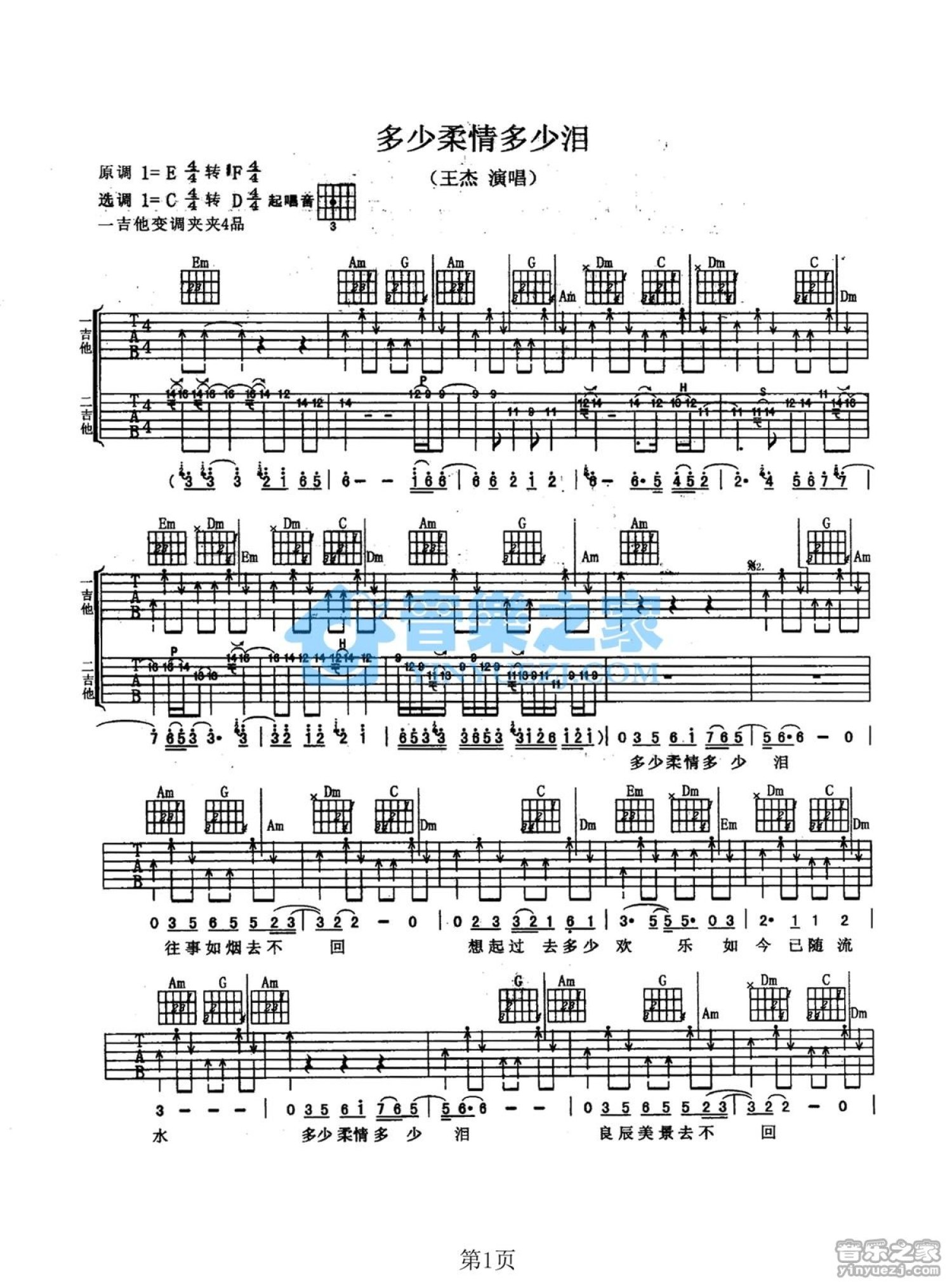曲谱介绍: C调《多少柔情多少泪》吉他弹唱六线谱