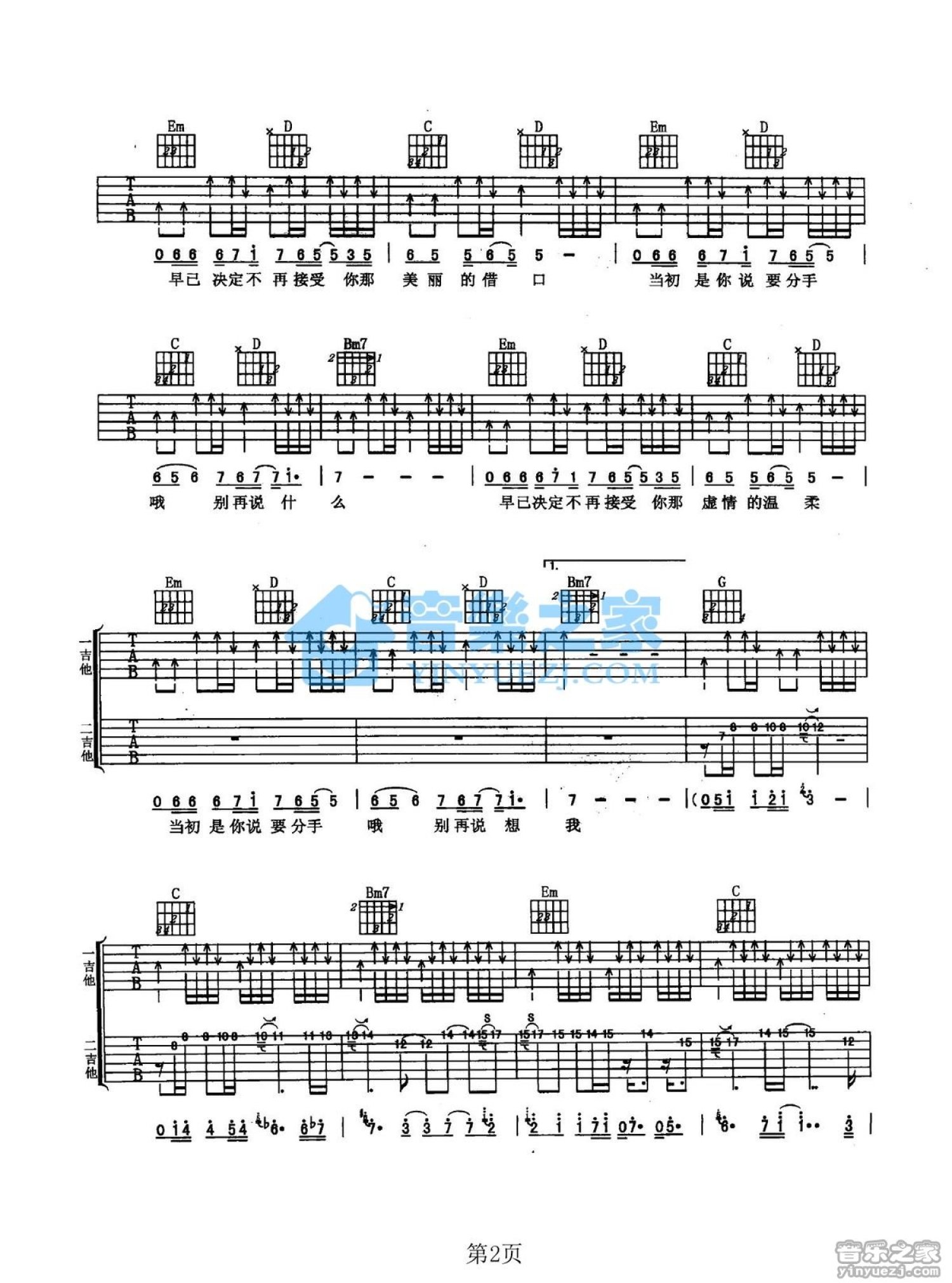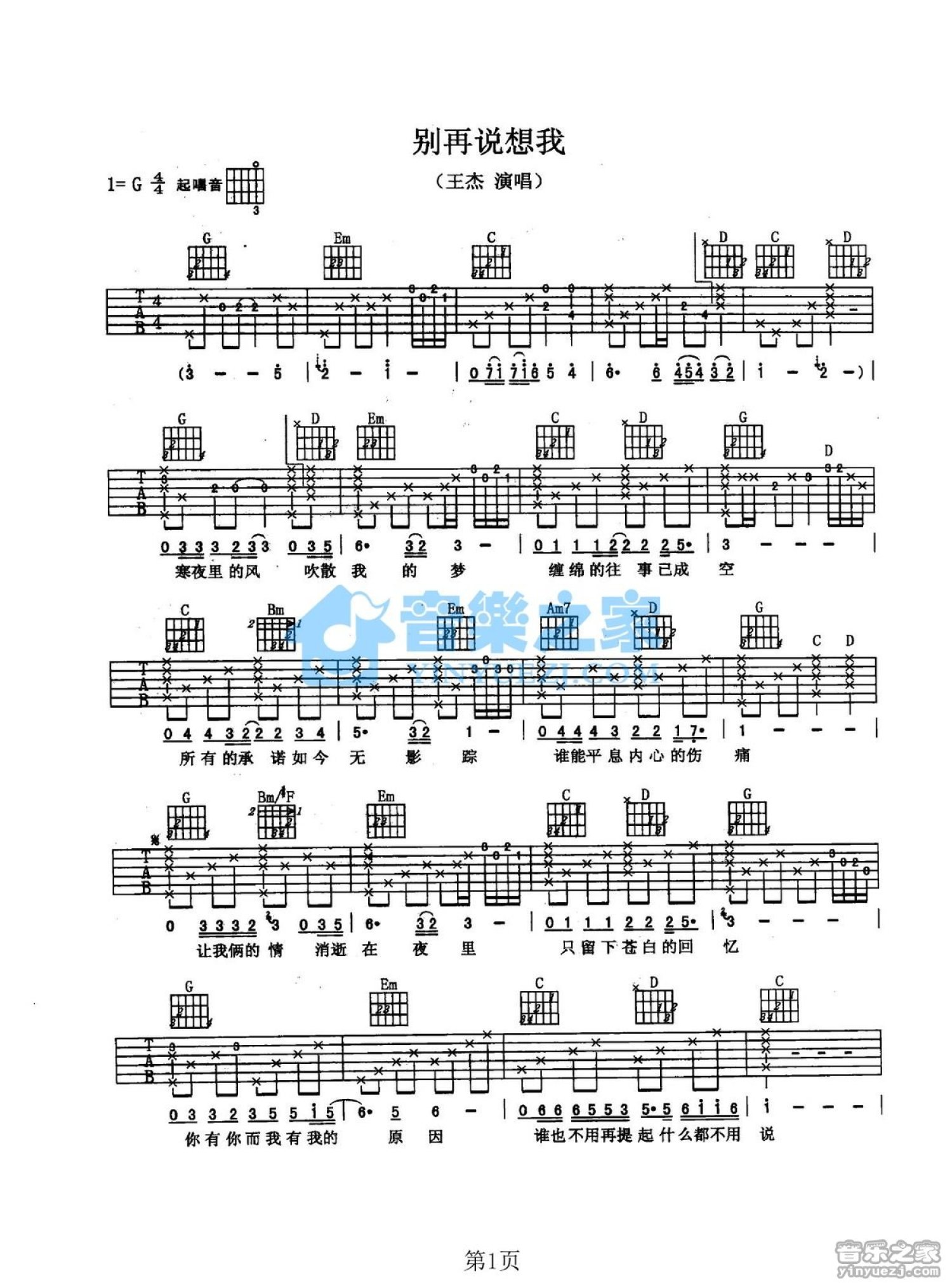 曲谱介绍: G调《别再说想我》吉他弹唱六线谱