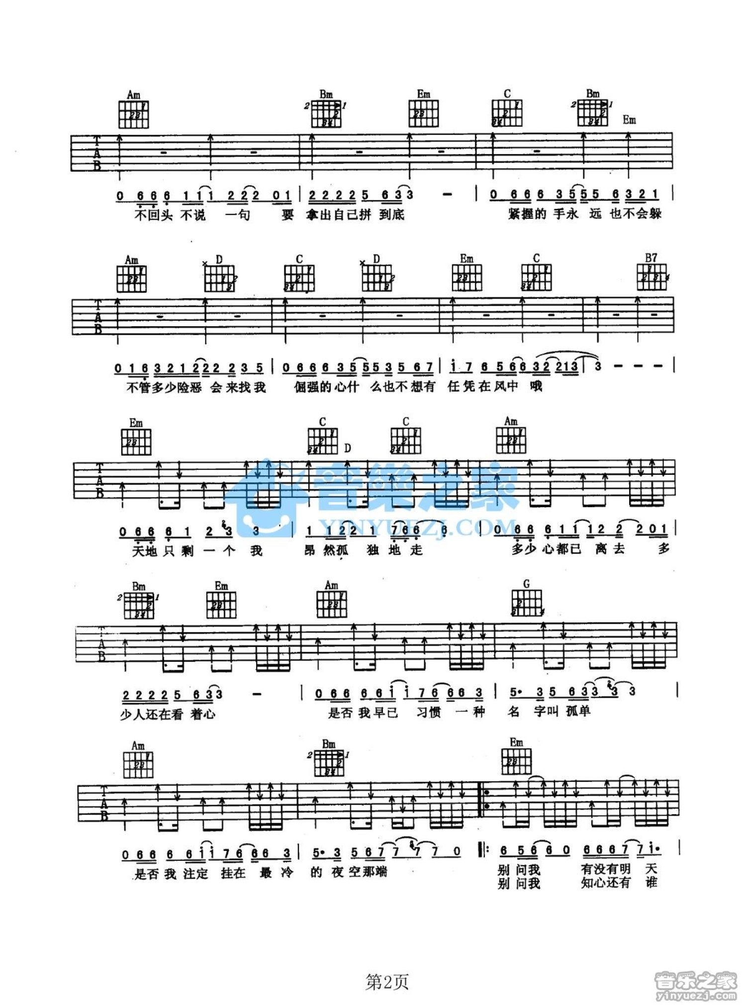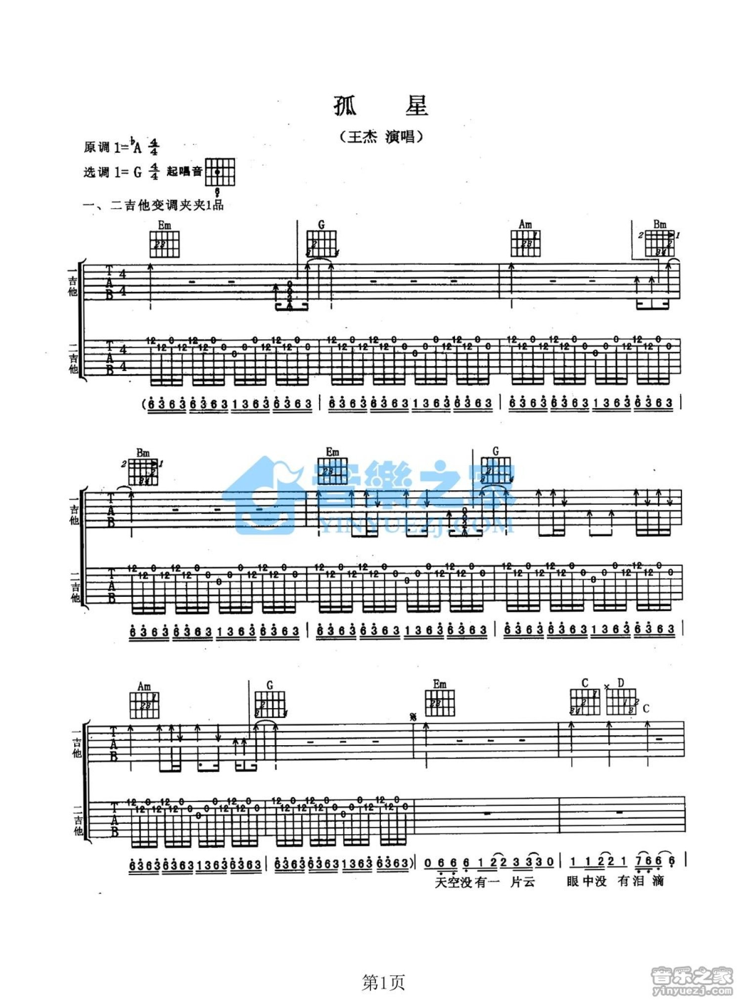 曲谱介绍: G调《孤星》吉他弹唱六线谱