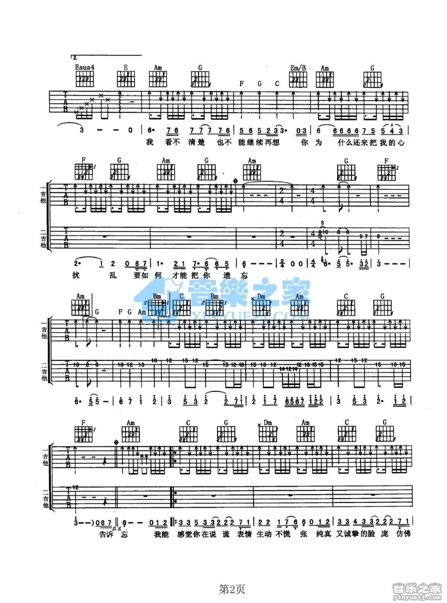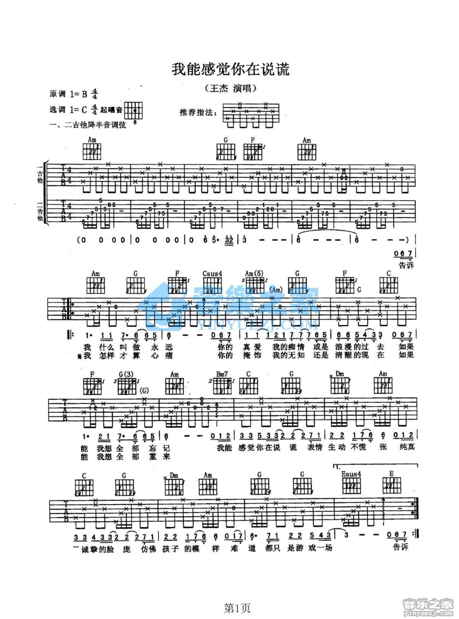 曲谱介绍: C调《我能感觉你在说谎》吉他弹唱六线谱