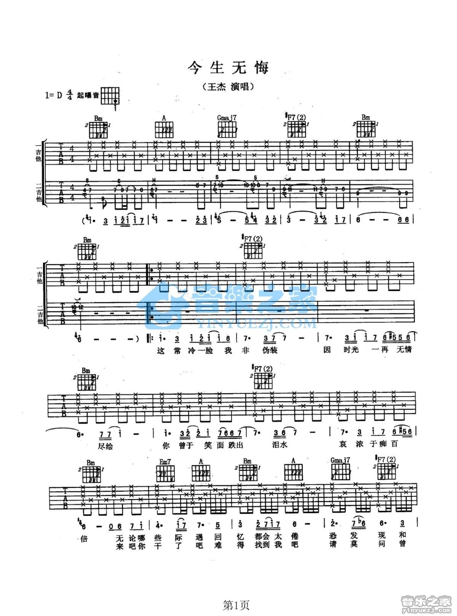 曲谱介绍: D调《今生无悔》吉他弹唱六线谱