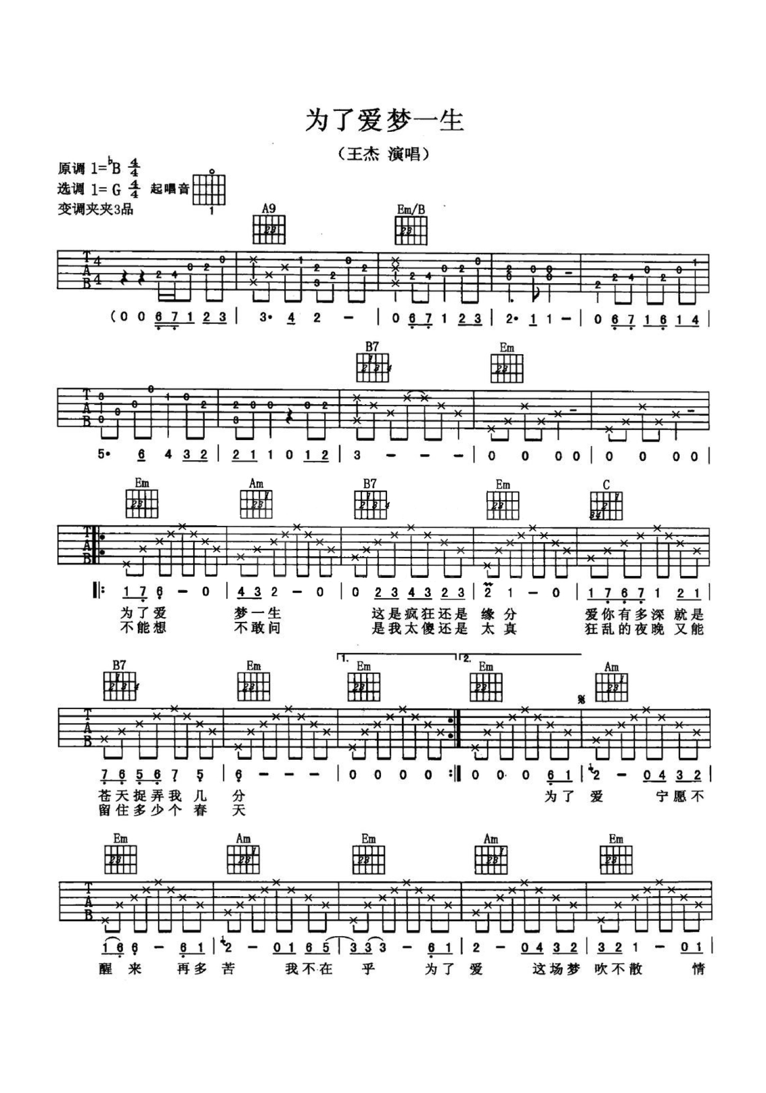 曲谱介绍: G调版《为了爱梦一生》吉他弹唱六线谱
