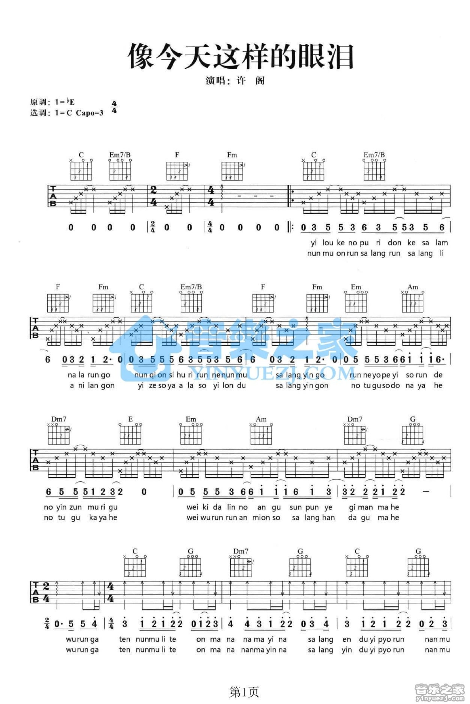 曲谱介绍: C调版《像今天这样的眼泪》吉他弹唱六线谱