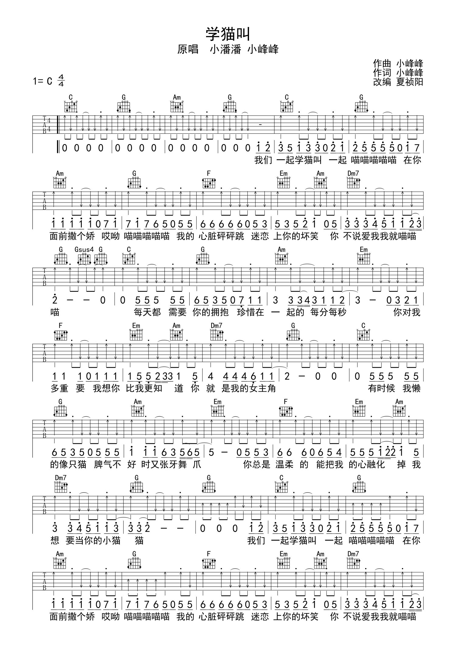 • 学猫叫吉他谱 - 小潘潘/小峰峰 - C调吉他弹唱谱第1张