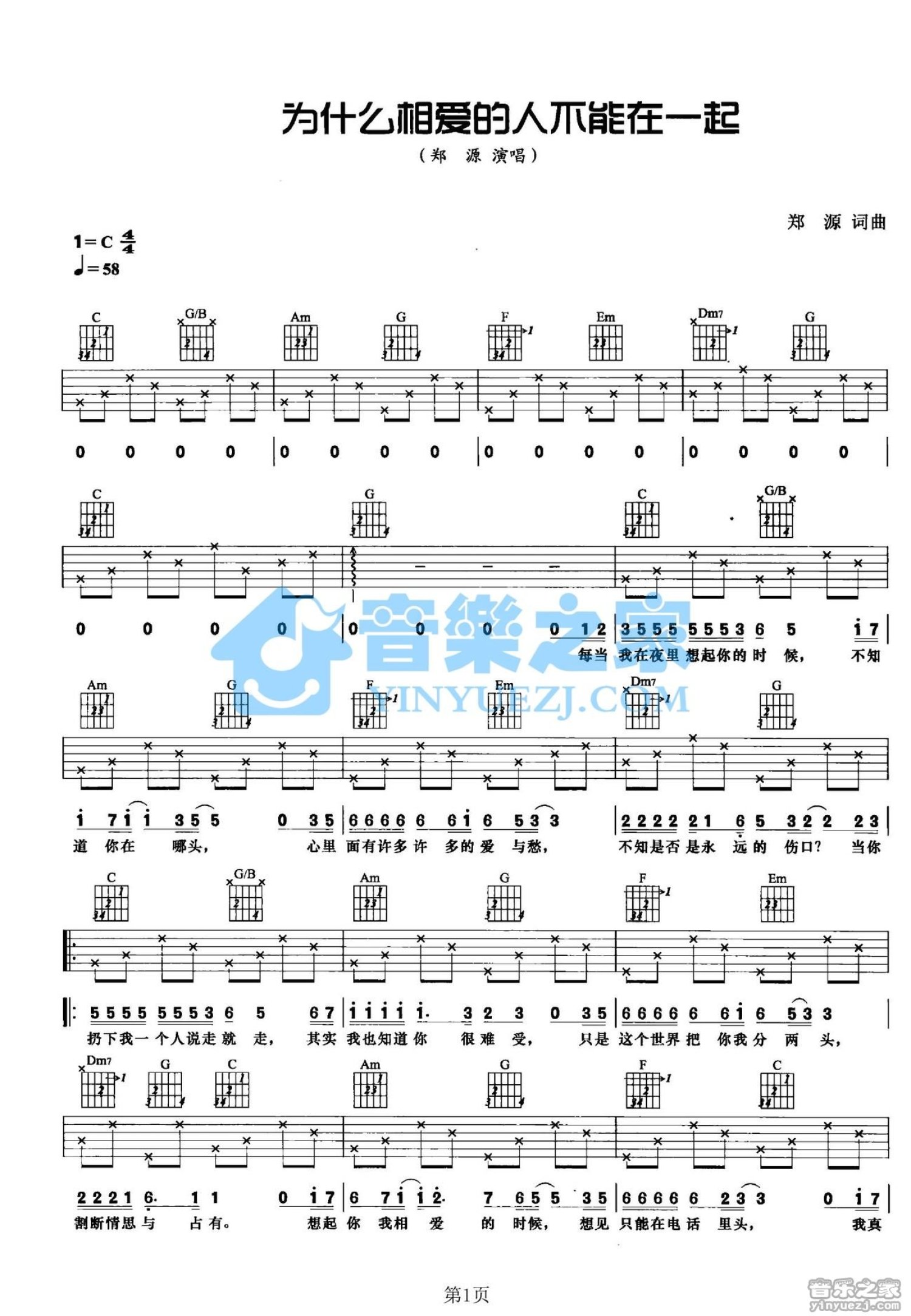 为什么相爱的人不能在一起吉他谱 - 郑源 - C调吉他弹唱谱