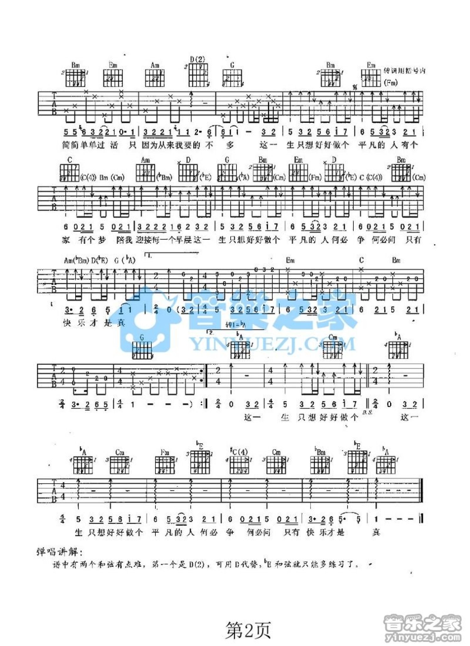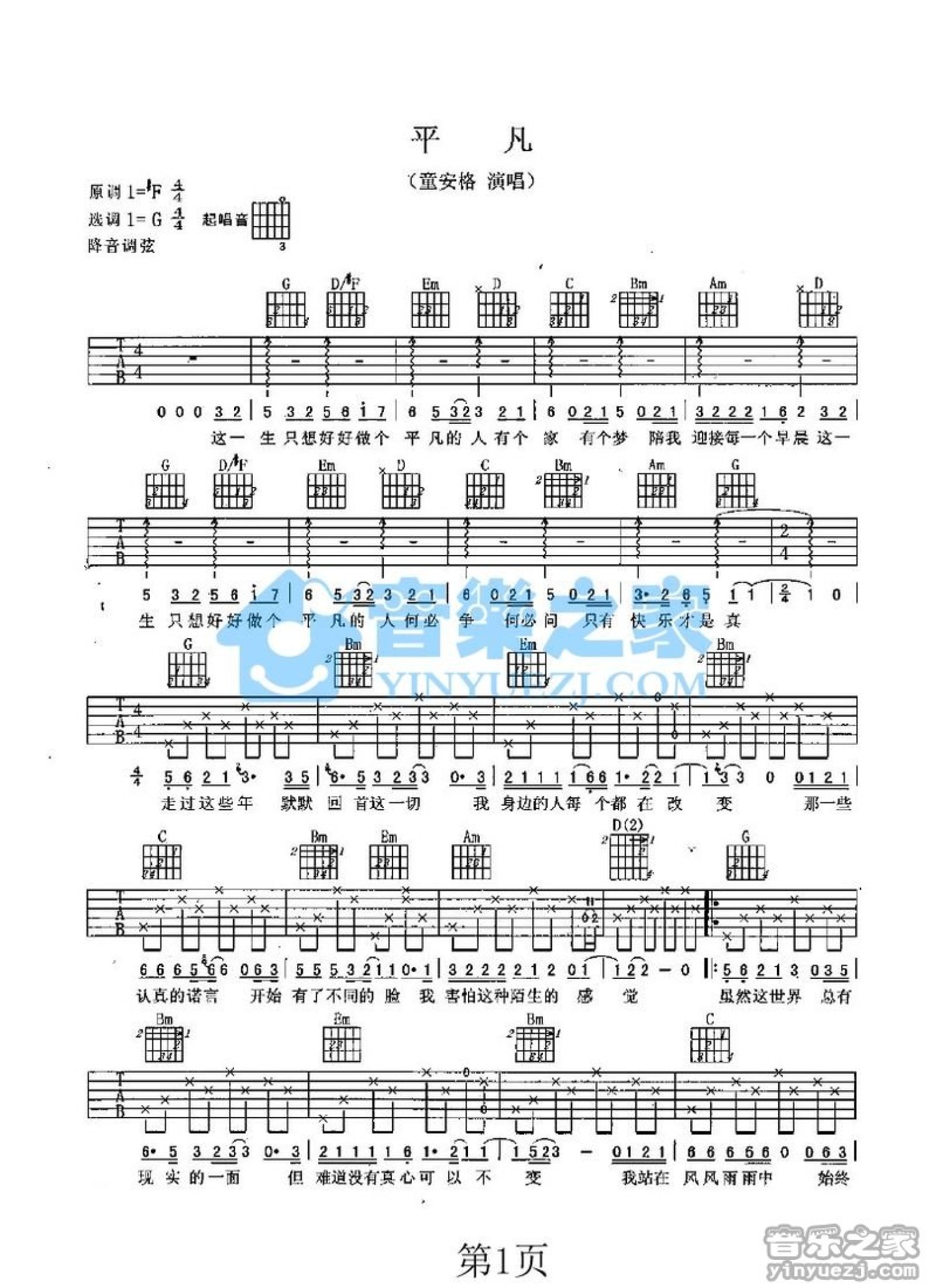 曲谱介绍: G调版《平凡》吉他弹唱六线谱
