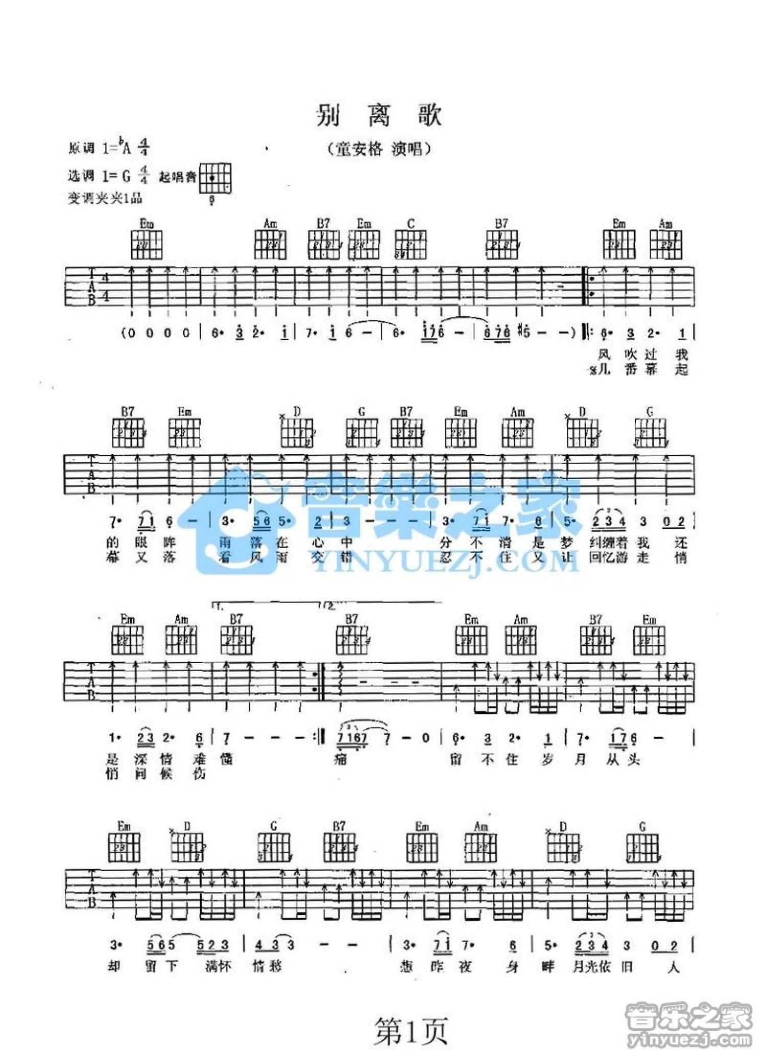 曲谱介绍: G调版《别离歌》吉他弹唱六线谱
