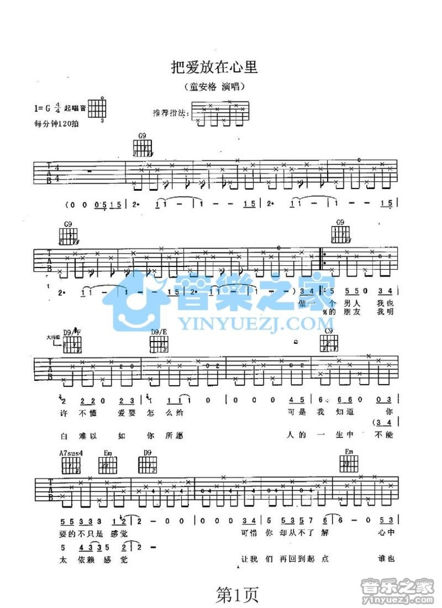 曲谱介绍: G调《把爱放在心里》吉他弹唱六线谱