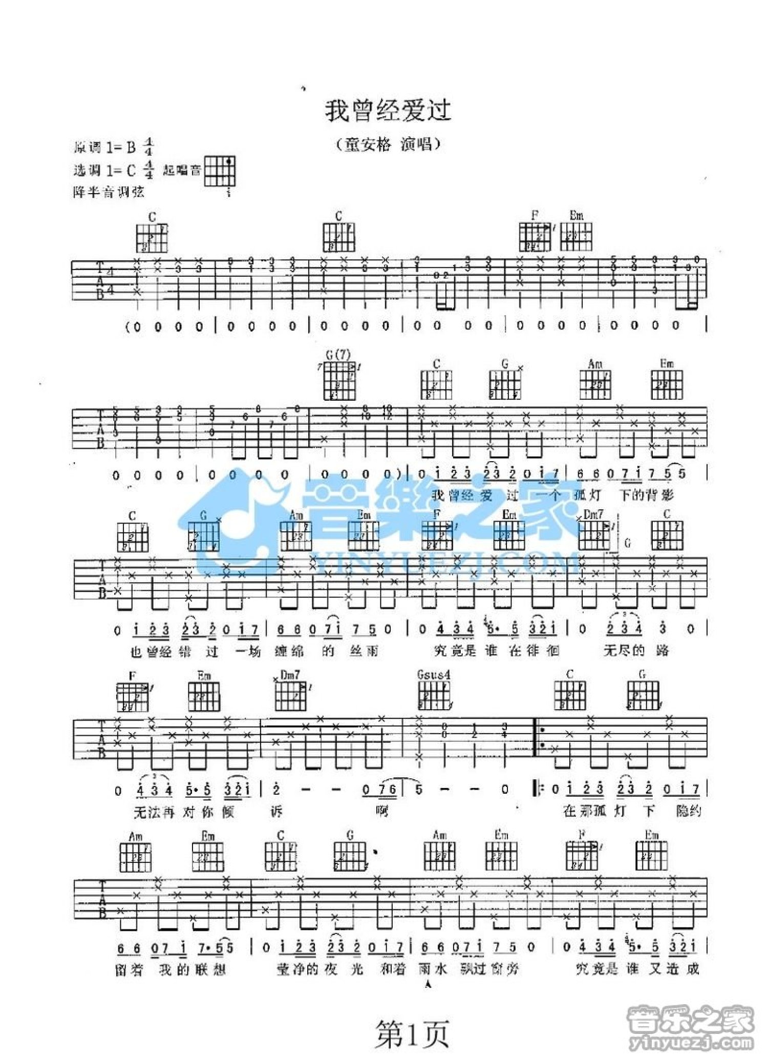 曲谱介绍: C调版《我曾经爱过》吉他弹唱六线谱