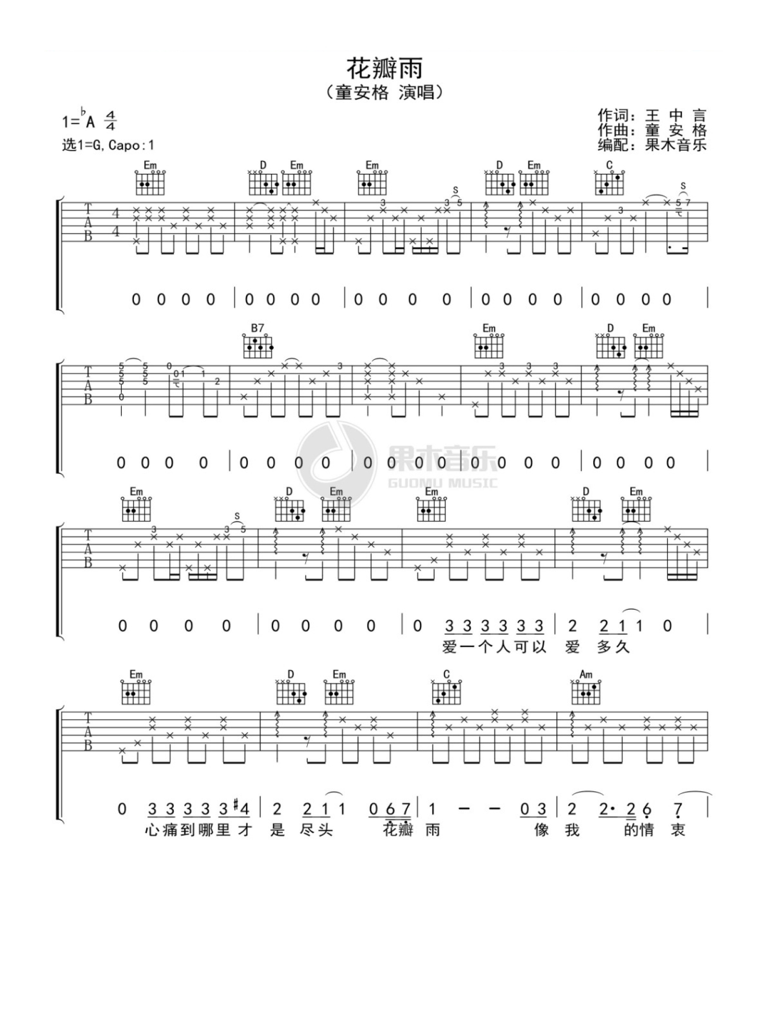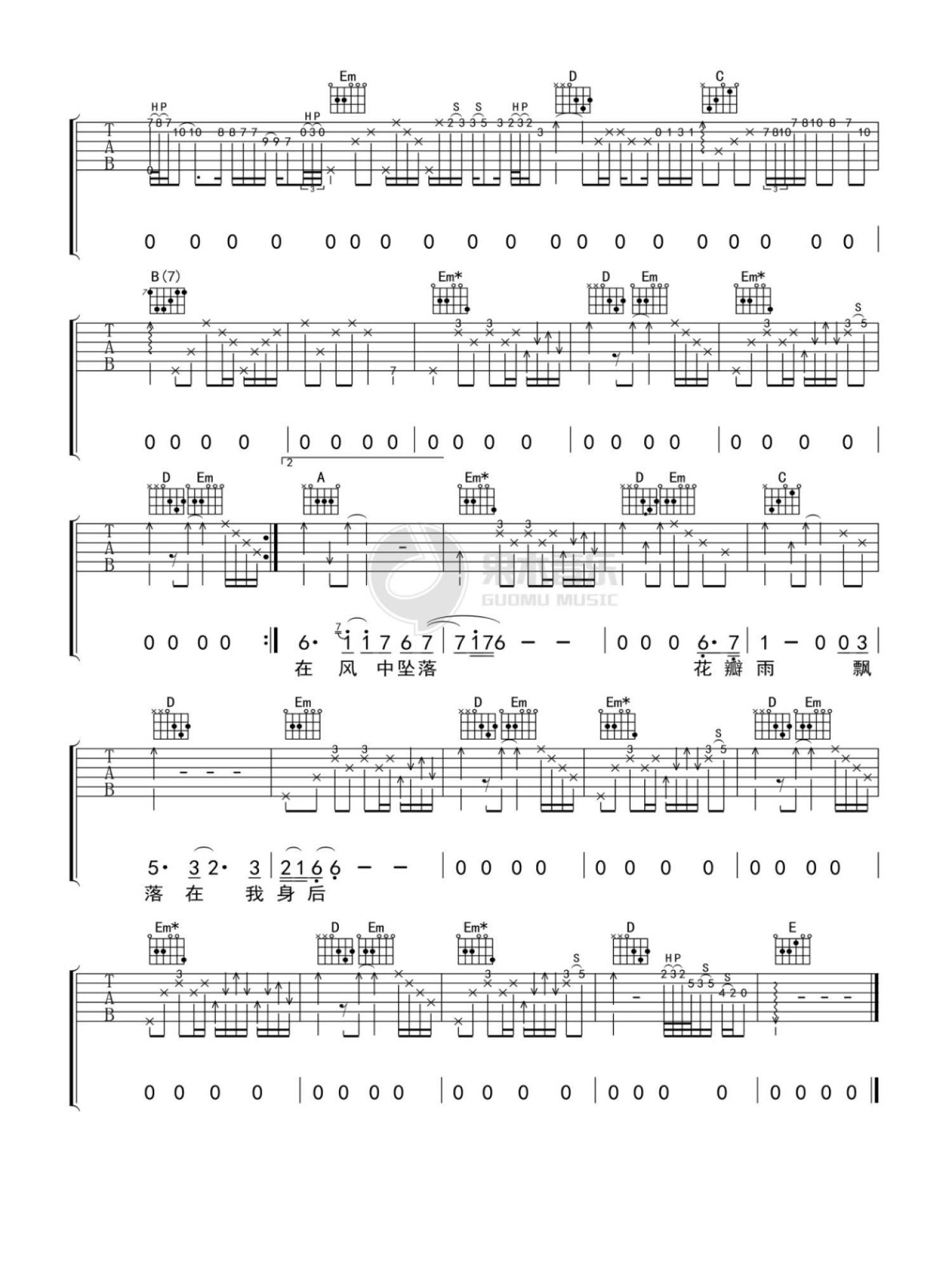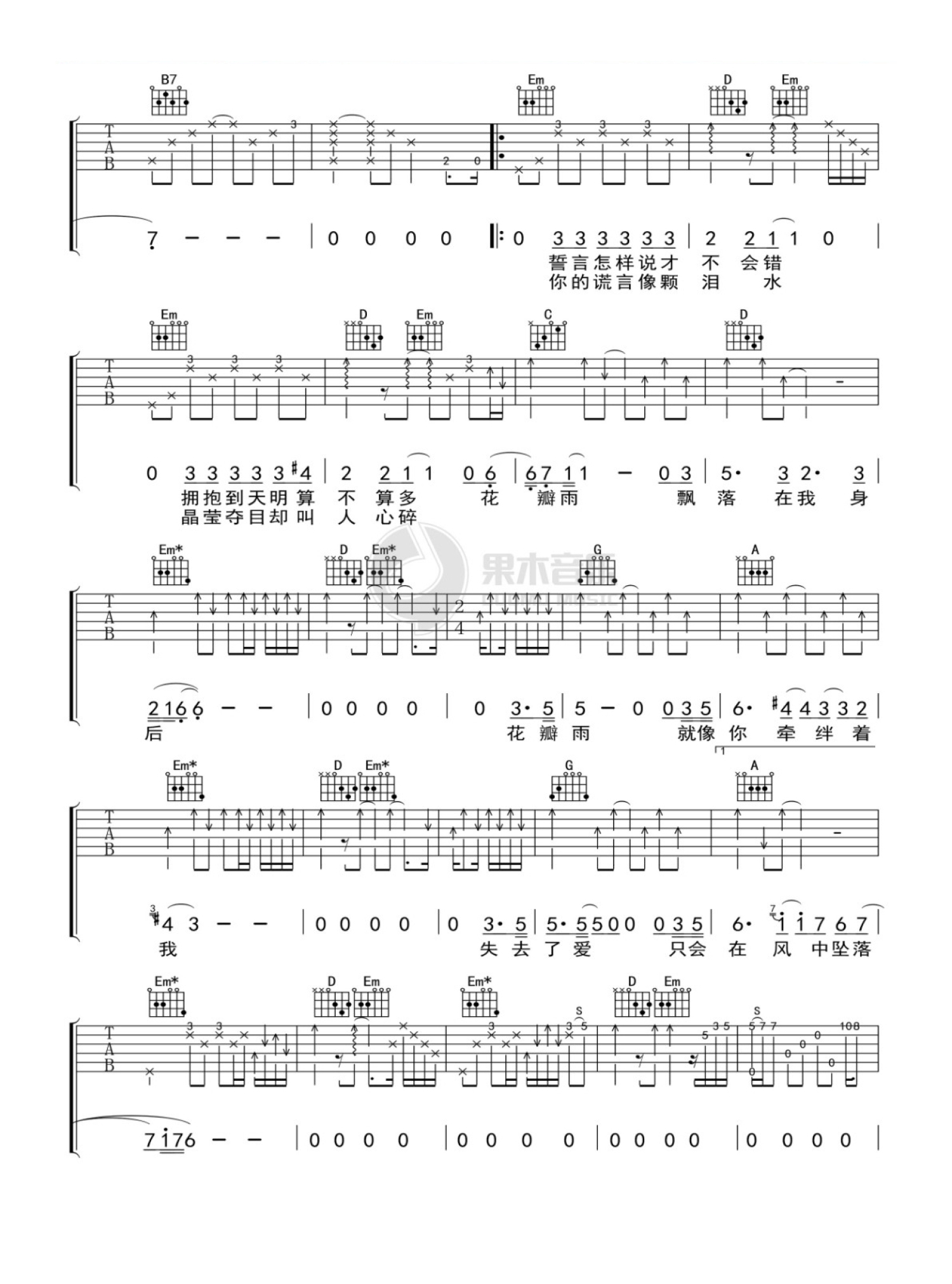 曲谱介绍: G调版《花瓣雨》吉他弹唱六线谱