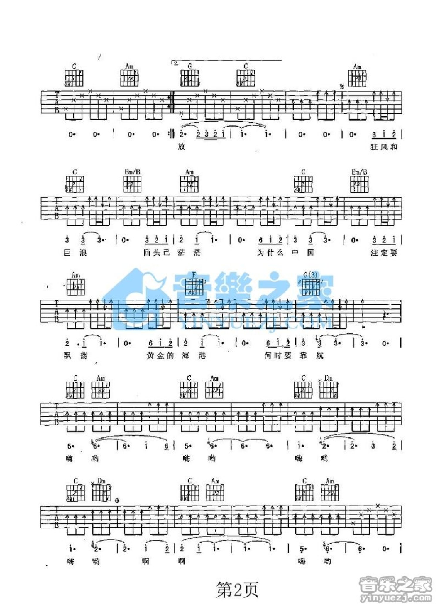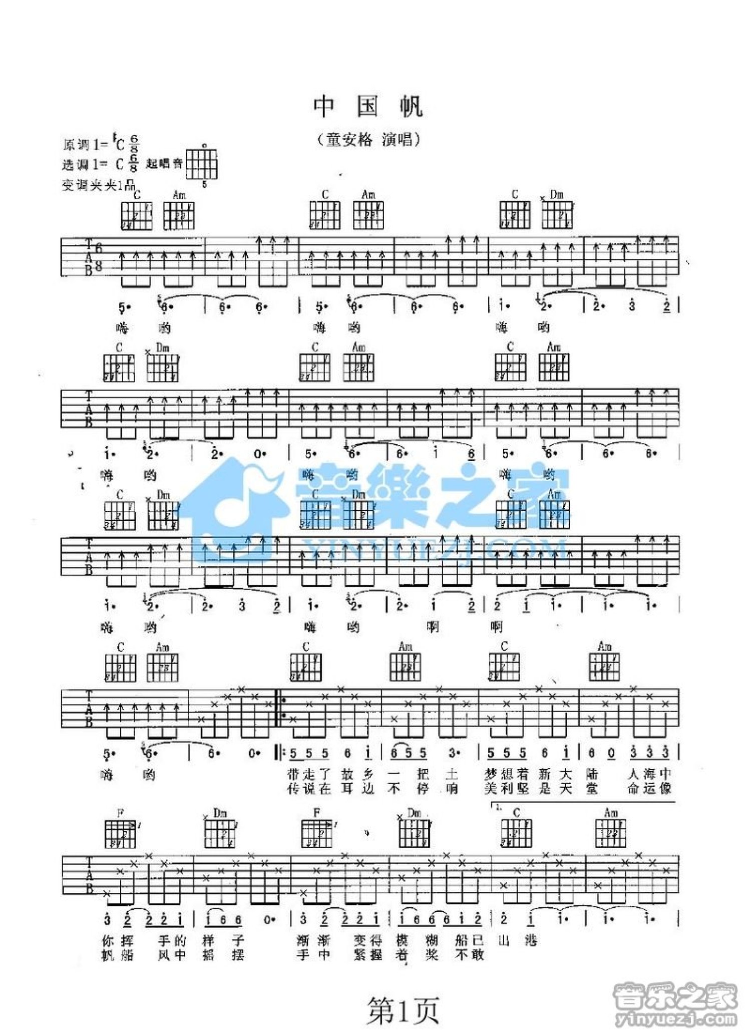曲谱介绍: C调版《中国帆》吉他弹唱六线谱